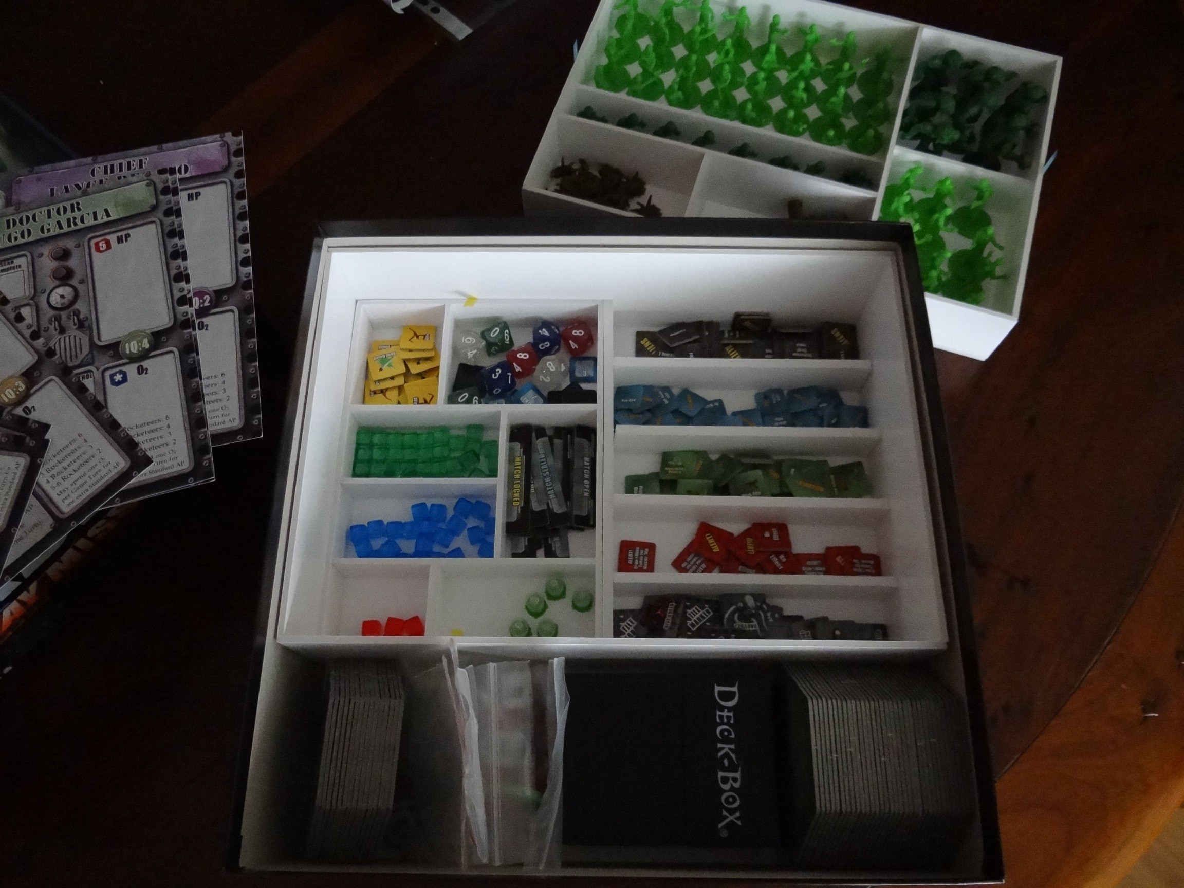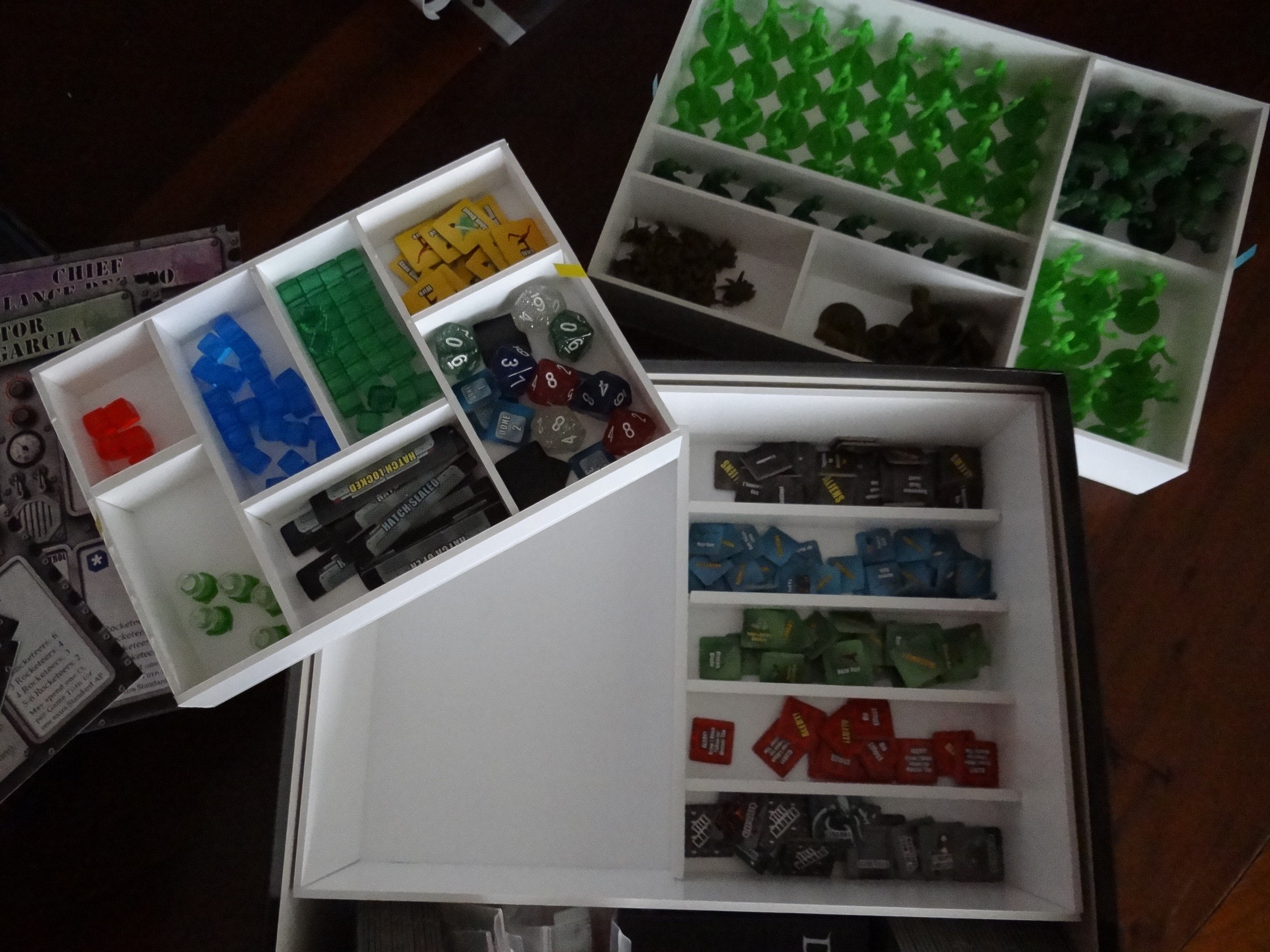 Bonjour, je viens de finir (ou presque) mon pimp boxing de mon tout récent SCAM. Il y a pas mal de matériel, mais la boite est assez aérée, donc il y avait possibilité de réorganiser tout cela. La boite avec ses compartiments qui se soulèvent peut devenir une piste de dé, d’ailleurs je verrais pour y mettre le tapis nécessaire. Les modules amovibles sont fait pour aller sur la table pour un remplacement plus rapide des jetons par les figurines, et pour avoir les figurines sous la mains pendant la partie. Je pense ajouter un module pour les cartes histoire d’éviter de les trier ou sortir à chaque fois, mais il faut voir si je les sleeve avant…