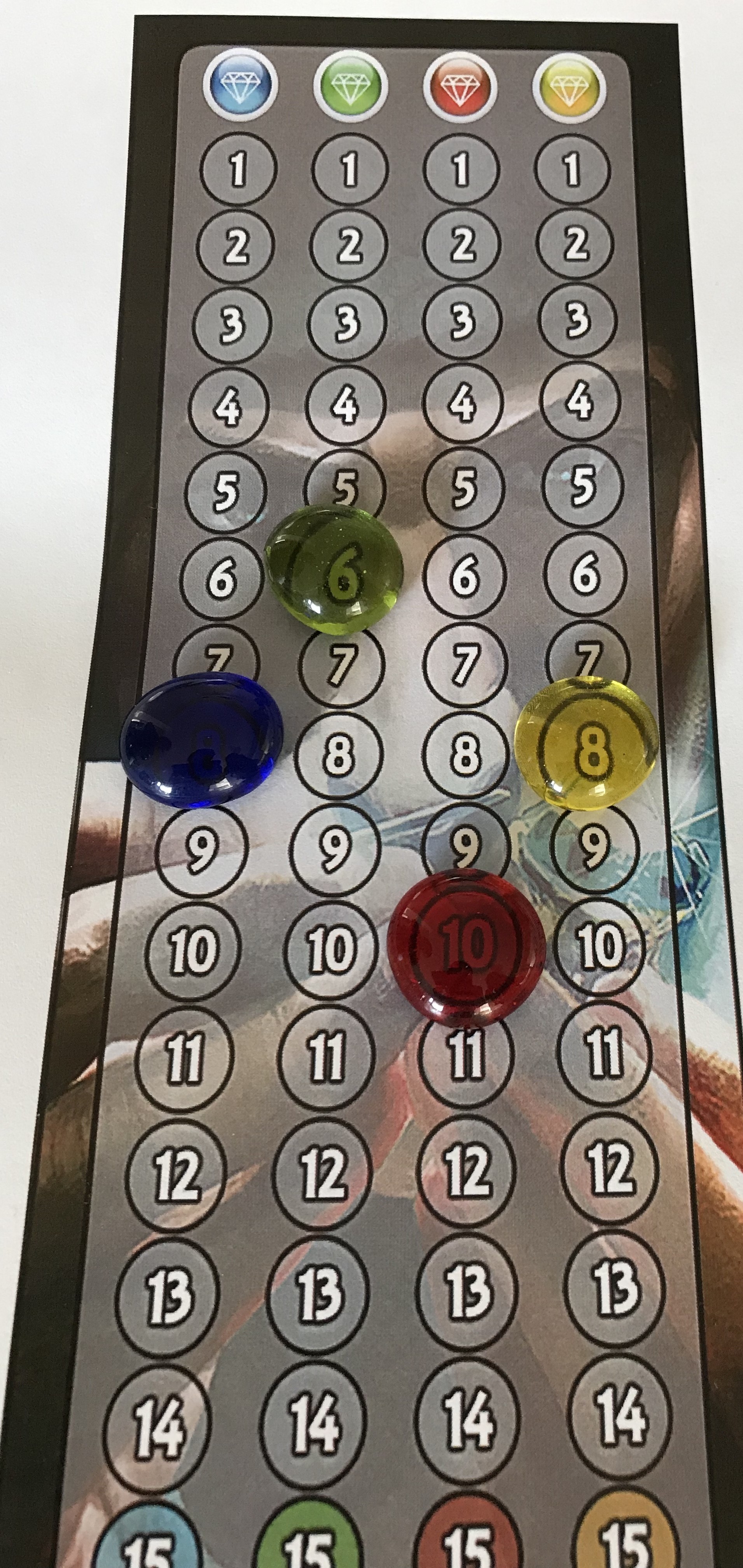 Pas trop fan non plus. Déjà, les joueurs ayant une couleur, ça prête à confusion (les pierres précieuses ayant une couleur). Et puis ça s’arrête à 15 alors qu’avec l’extension ça peut varier.