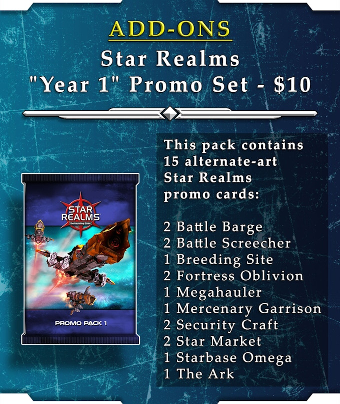 Pour qu'ils se fassent pardonner ce manque de professionnalisme , demandez leur le droit d'éditer les cartes promos du supplément Gambit, car soyons franc c'est ce qui est le plus intéressant dans cette extension:http://www.starrealms.com/gambit-expansion/ . Je parle bien des Ships & Bases Year One Promos .