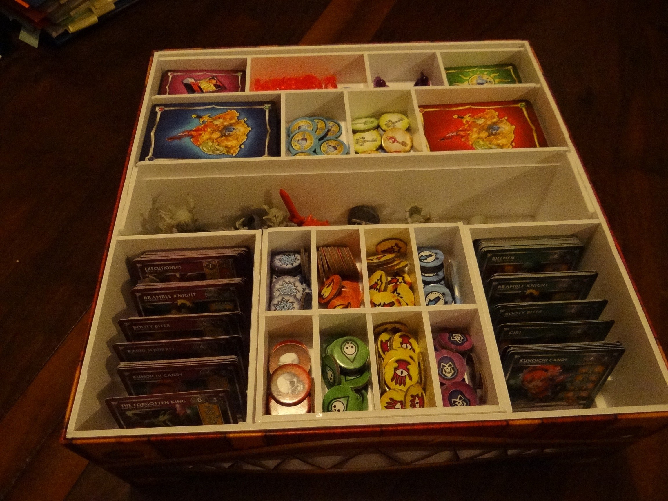 Alors l’idée, puisque que la V2 est en ce moment sur KS et qu’il y aura une nouvelle boite de base, c’est de mettre tous le matériel commun aux extensions dans une seule boite (héros, cartes, pets, trésor, pions, boo booty…) et de mettre les plateau et les monstres propres d’une extension dans sa boite (les spawn organisés par type, les mini boss rassemblés, le boss avec ses cartes, et éventuellement les pions inutiles car surnuméraires).