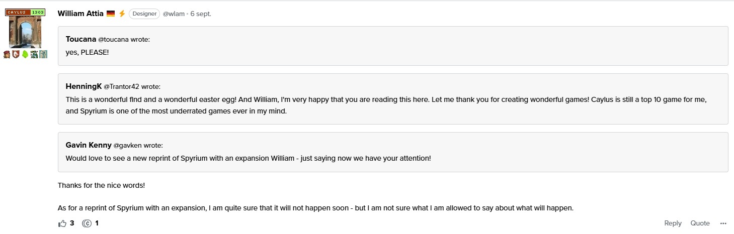 Et histoire de remettre une pièce, un message sur BGG de William Attia concernant Spyrium qui date d’il y a quelques semaines :