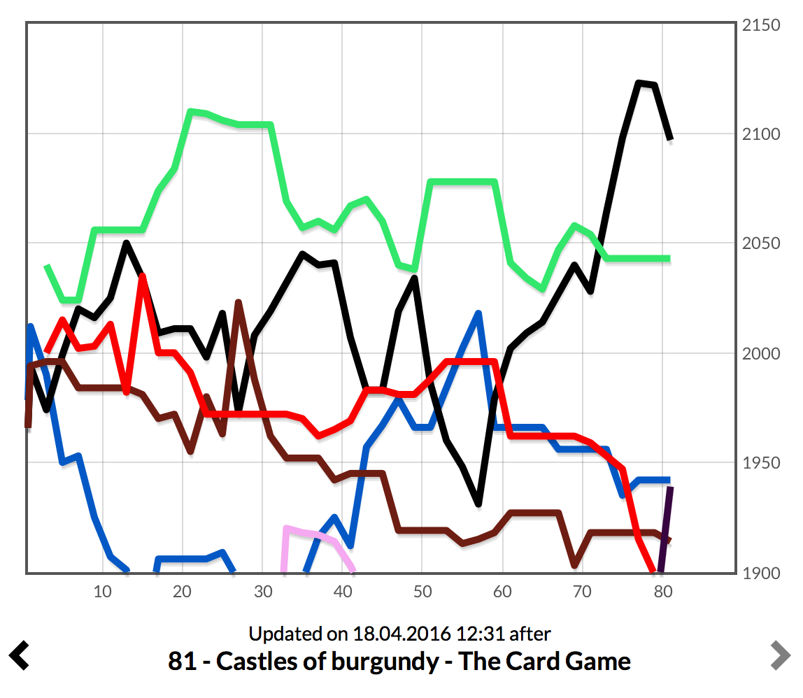 Sur le long terme je ne suis pas sur que ce soit viable, car un joueur qui joue beaucoup (moi, en noir), gagnera forcément plus de points qu’un joueur qui joue moins souvent, même si ce dernier en gagnera plus d’un coup en cas de belle partie. Mais sur un weekend c’est vraiment sympa.