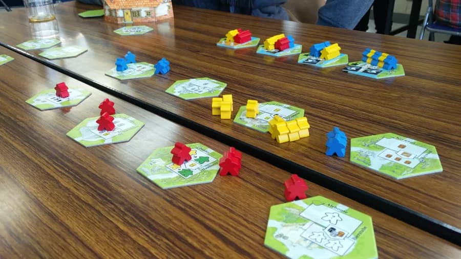 chacun son tour va placer 1 ou plusieurs meeples d’une couleur autour d’une tuile pour essayer d’être majoritaire