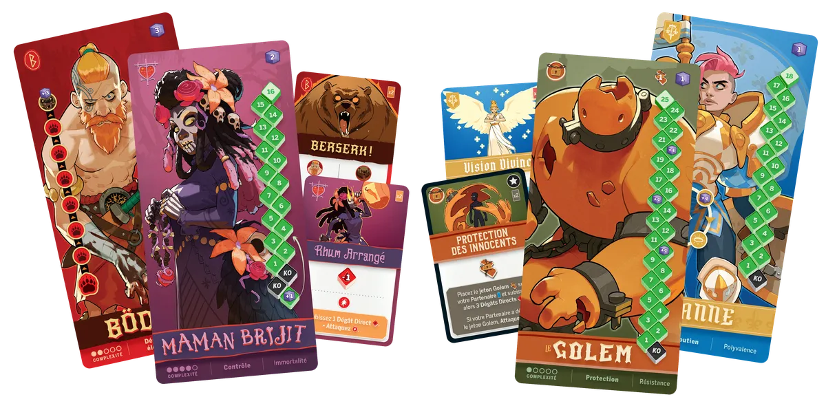 Il y a 12 combattants dans la boîte, chacun avec sa spécialité (combattant de soutien qui soigne son coéquipier, combattant “long terme” qui doit charger son attaque sur plusieurs rounds avant de faire des dégâts dévastateurs, etc.), ce qui permet de composer des équipes variées pour des combats très différents.