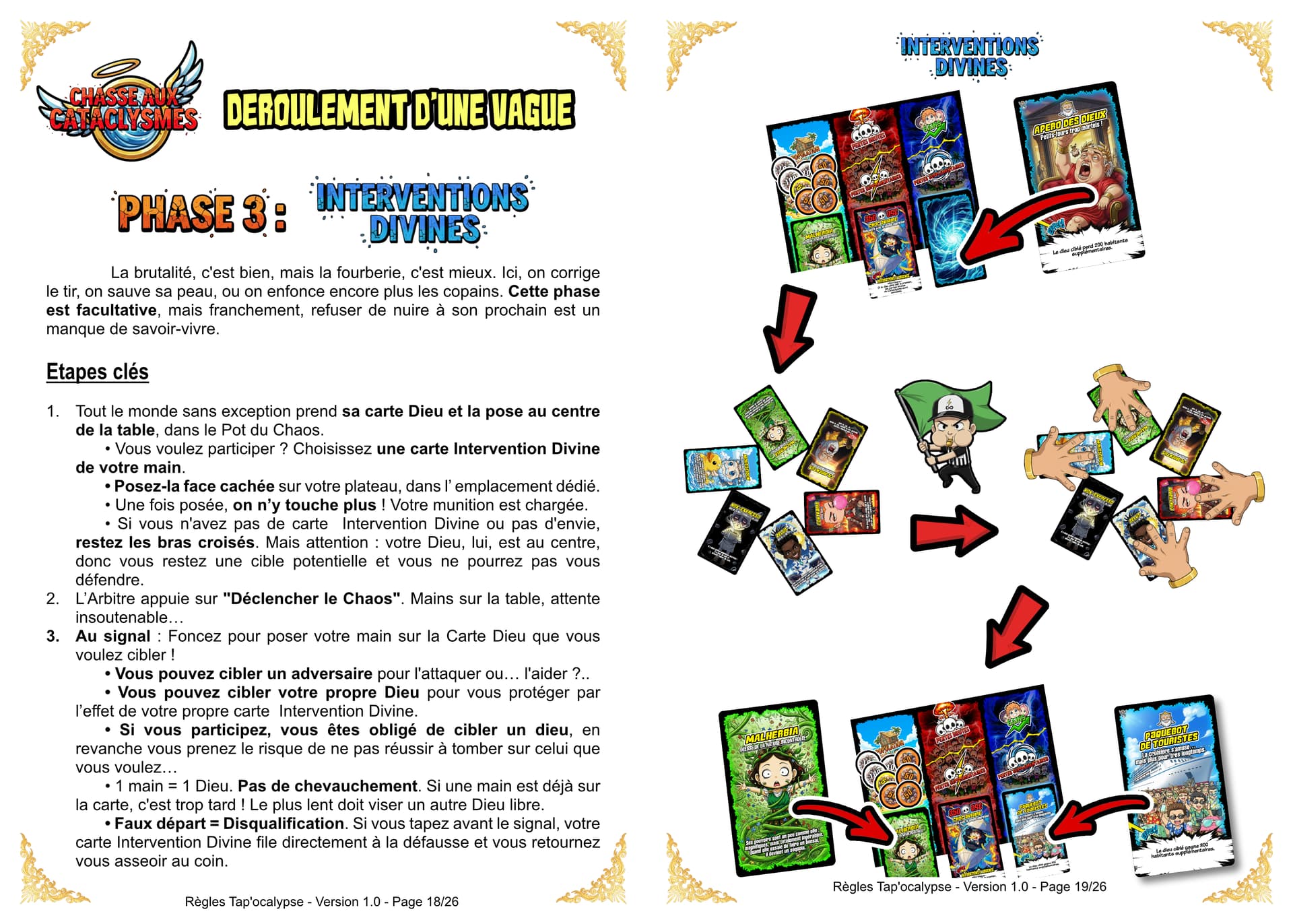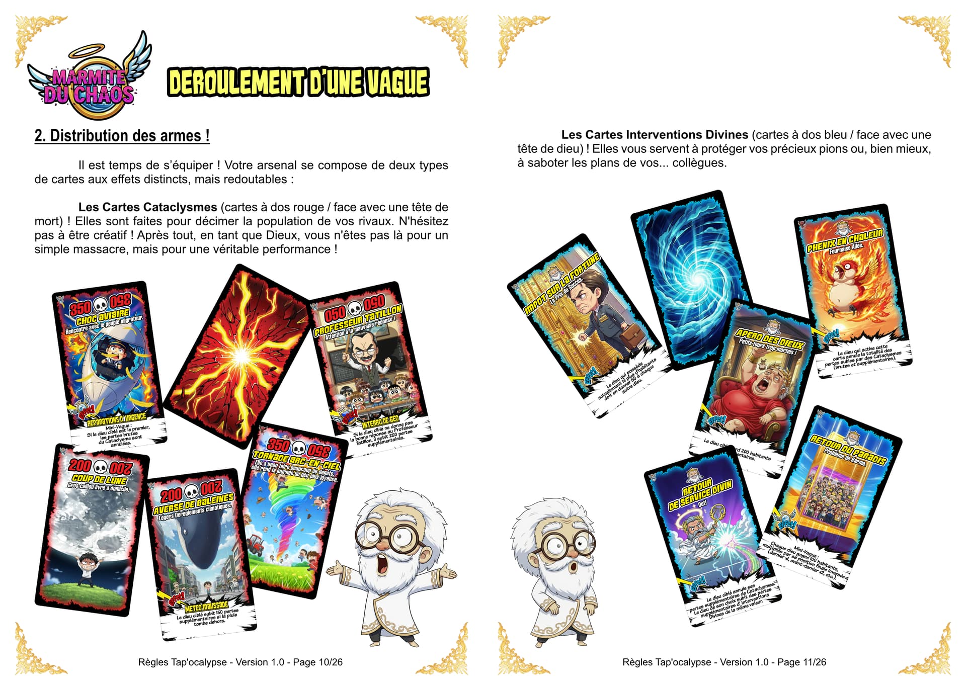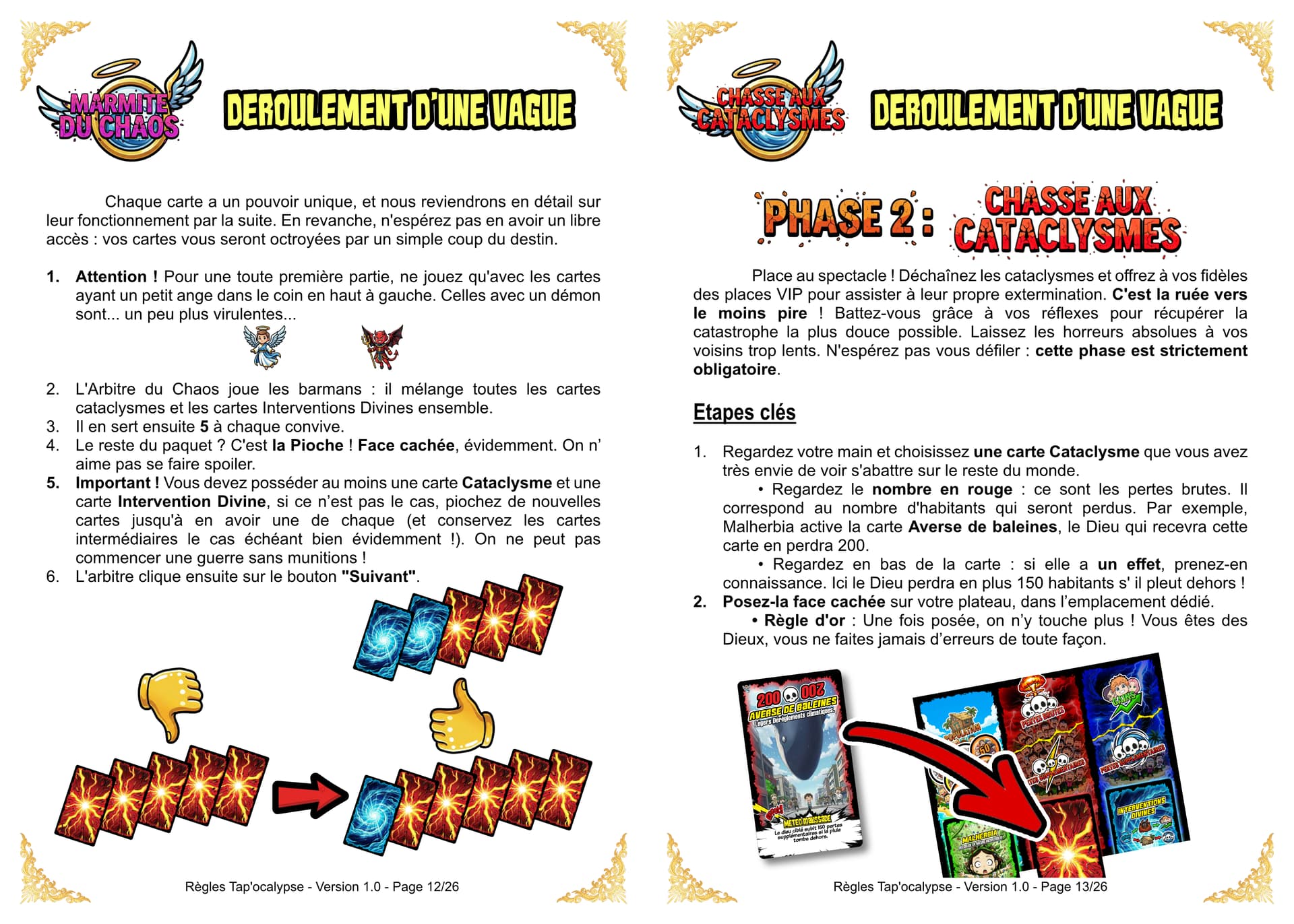 Bien entendu, même le chaos requiert un minimum d’organisation. La partie se déroule donc par Vagues. Un arbitre du Chaos sera désigné pour superviser la vague en cours et prendre les décisions en cas de litiges. Le destin (et le hasard) vous offre 5 cartes pour débuter. Votre main sera donc un joyeux mélange de Cataclysmes et d’ Interventions Divines (il faut au moins une carte Cataclysme). Chaque Vague est un cycle de destruction en trois actes :
