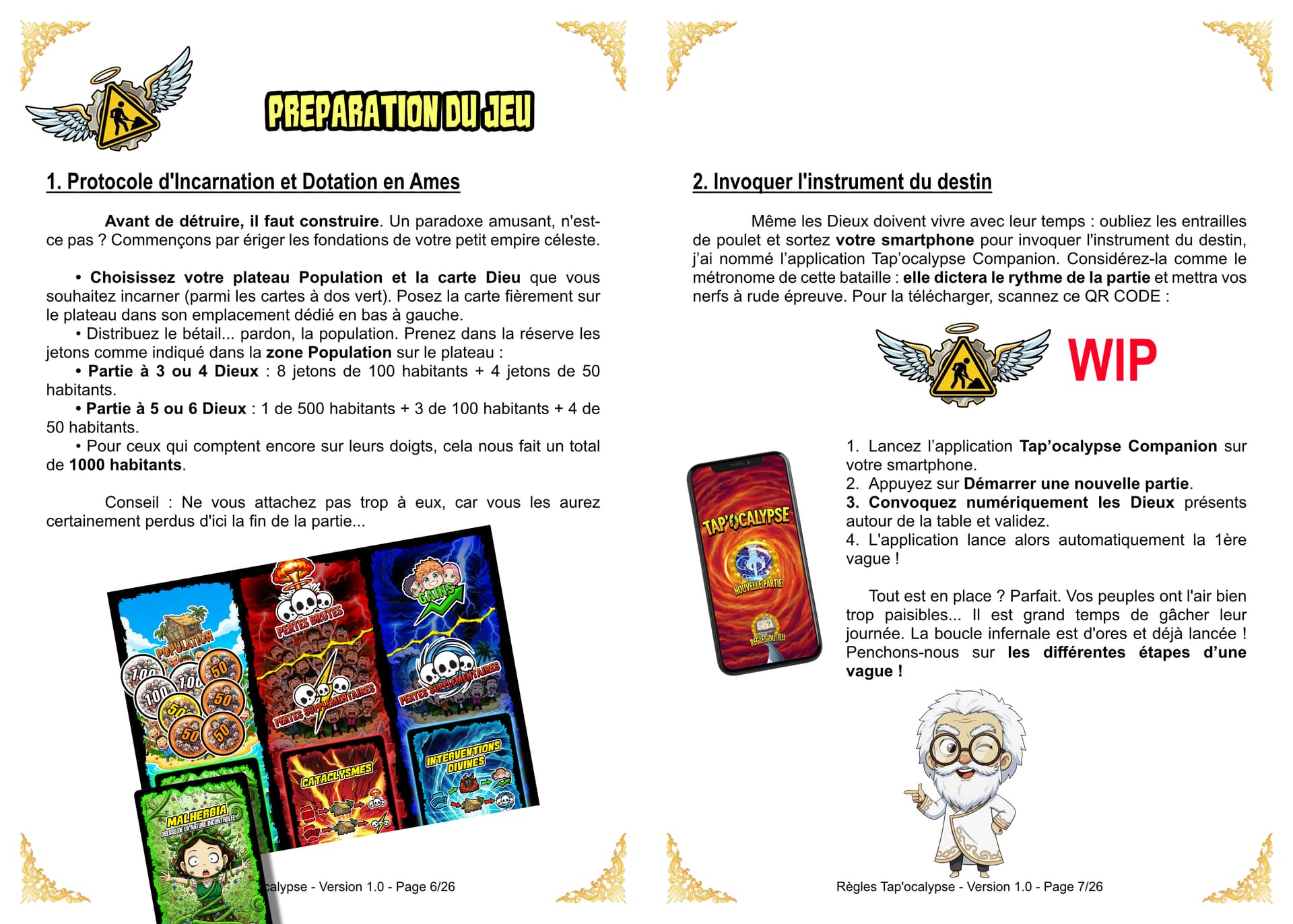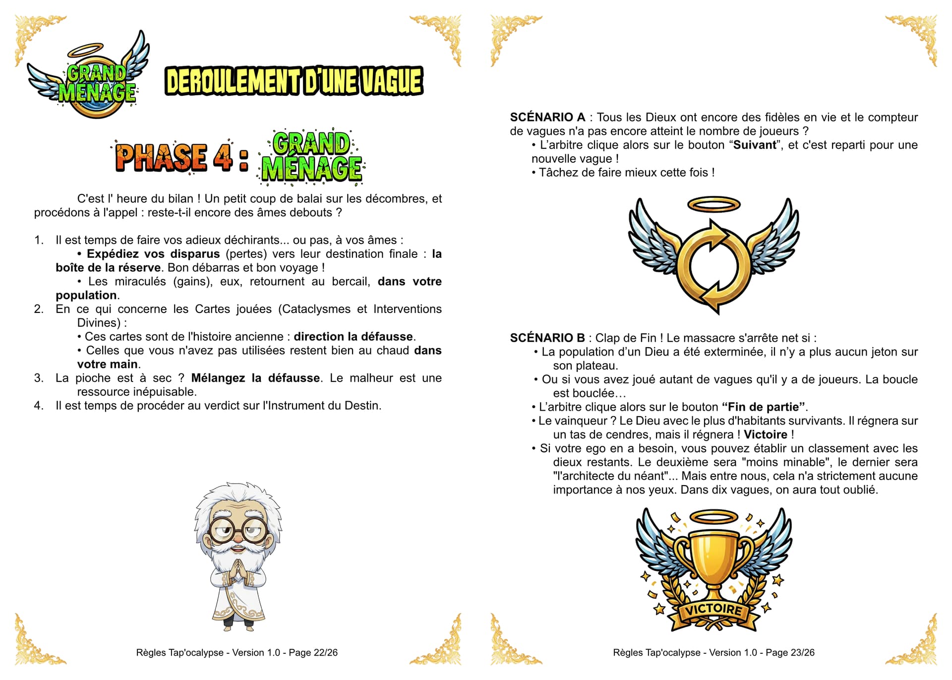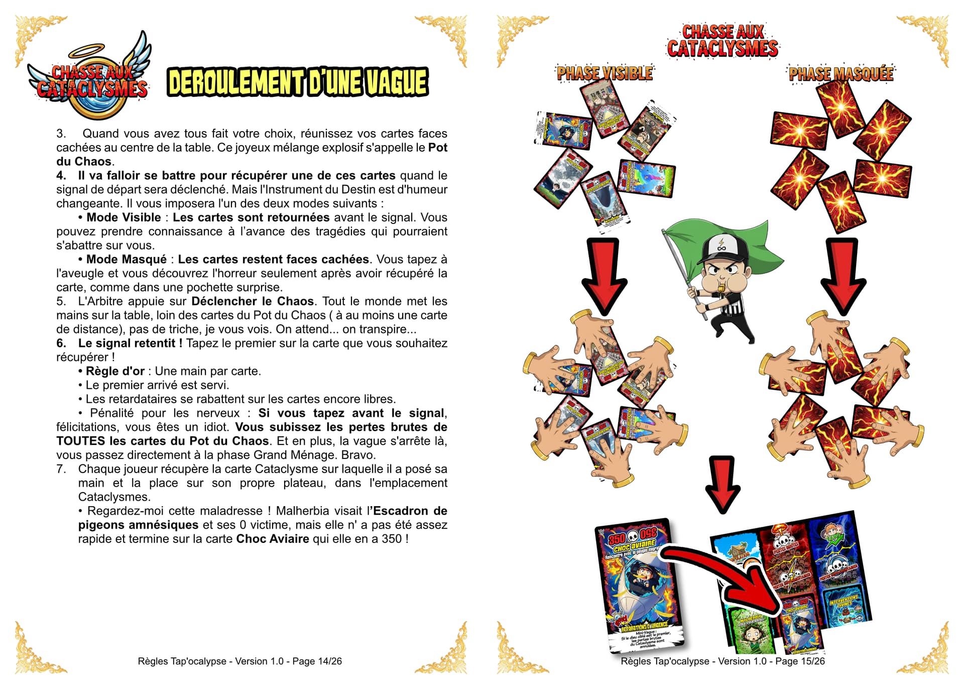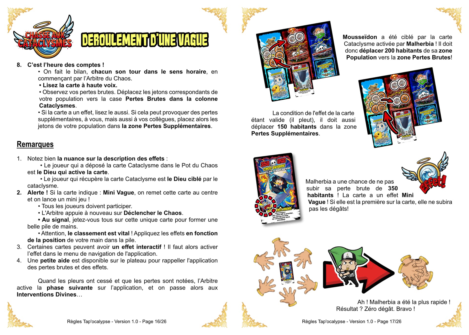 Bien entendu, même le chaos requiert un minimum d’organisation. La partie se déroule donc par Vagues. Un arbitre du Chaos sera désigné pour superviser la vague en cours et prendre les décisions en cas de litiges. Le destin (et le hasard) vous offre 5 cartes pour débuter. Votre main sera donc un joyeux mélange de Cataclysmes et d’ Interventions Divines (il faut au moins une carte Cataclysme). Chaque Vague est un cycle de destruction en trois actes :