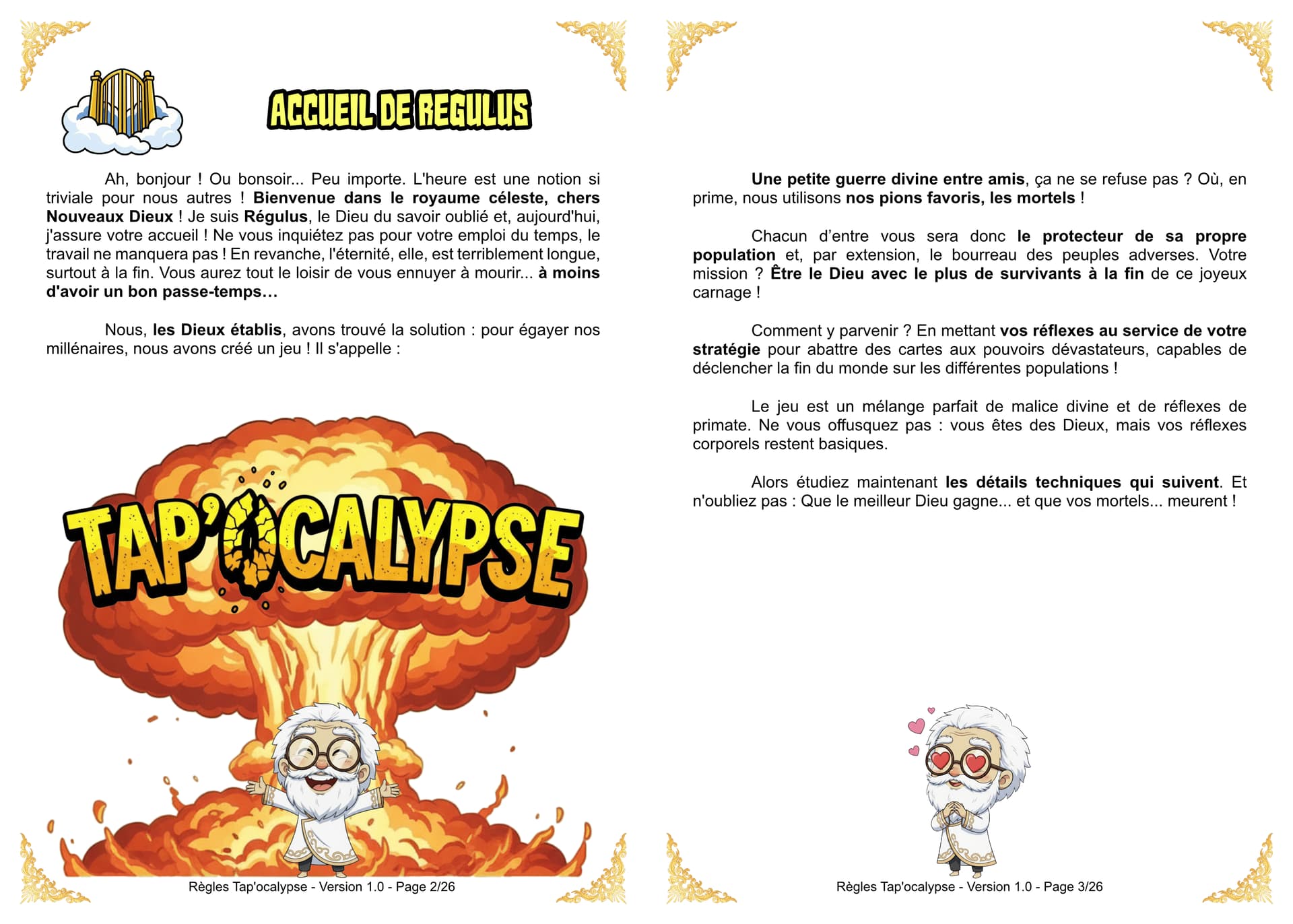Nous, les Dieux établis, avons la solution : pour égayer nos millénaires, nous avons créé un jeu ! Il s’appelle Tap’ocalypse ! Une petite guerre divine entre amis, ça ne se refuse pas ? Et le meilleur dans tout ça ? Nous utilisons nos pions favoris : les mortels !