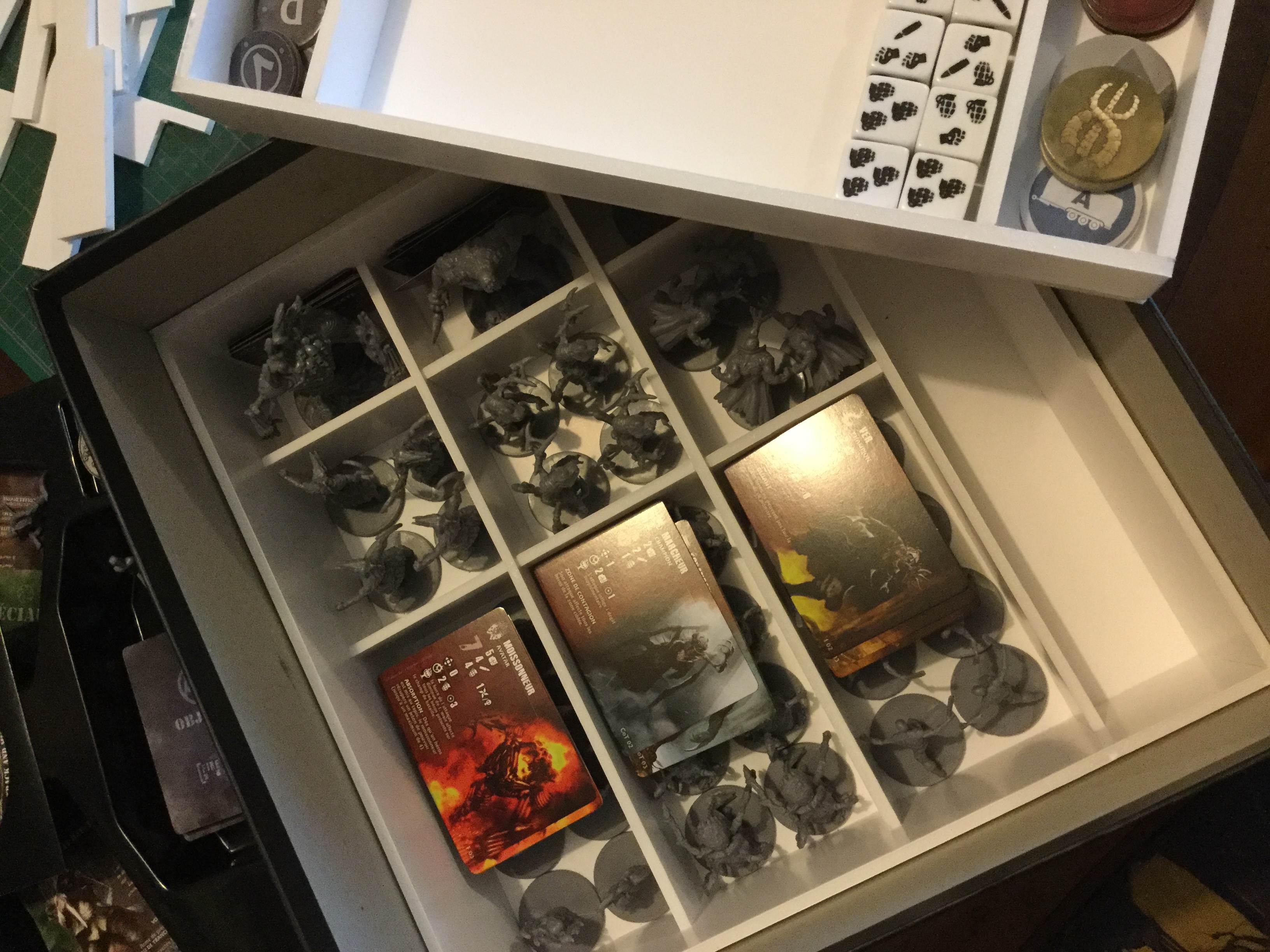 un petit pimp provisoire, parce que j’ai vraiment du mal avec des figurines alignées dans une boîte séparée avec un thermophormage qu’il faut ouvrir et trier… Ici c’est classé par famille avec les cartes attitrées. Ça va plus vite pour la mise en place. Et pareil le thermo pour les cartes est rangé par catégorie de héros.
