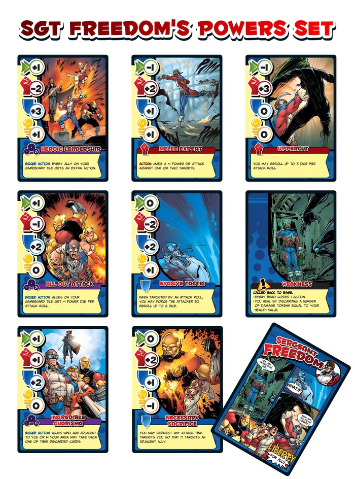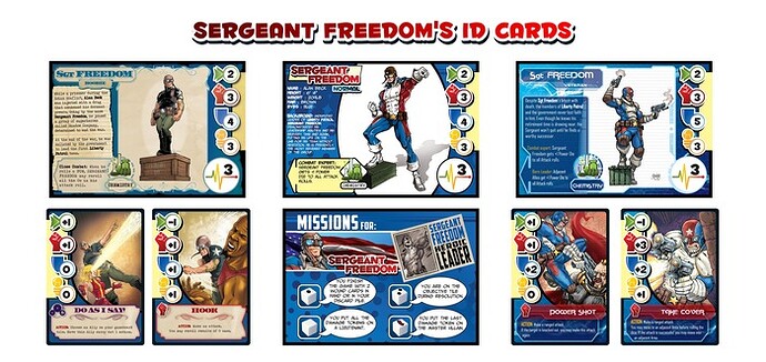 La nouvelle update a montré un peu de matos en se focalisant sur les cartes du Sgt Freedom, le problème c’est que Kickstarter semble réuploader les images et en changer la taille, donc on ne voit pas super bien (mais bon c’est mieux que rien quand même).