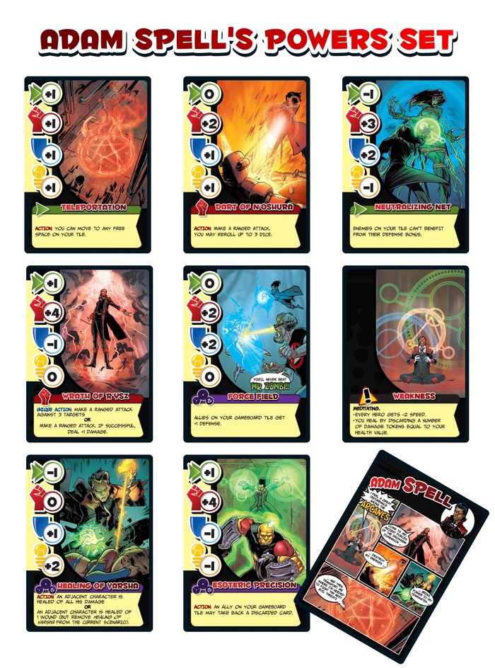Et maintenant, à la demande de Mr Zombi, voilà les fiches de personnage et pouvoirs d’Adam Spell!