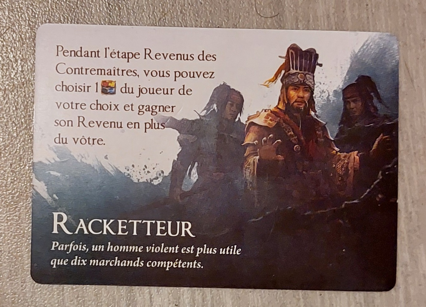 Mon général me pousse à jouer des cartes tactiques et comme les cartes tactiques jouent sur l’attaque, je vais attaquer… Je serais le plus combatif en début de partie, mes camarades se concentrant plus sur leur moteurs. Ils atteindront d’ailleurs assez rapidement le niveau max de contremaître sur l’or et aussi sur le Chi pour D grâce à son guide spirituel. Je vais profiter des contremaître d’or et de Chi de D avec mon Racketteur suivant les circonstances, très utile ce pouvoir !