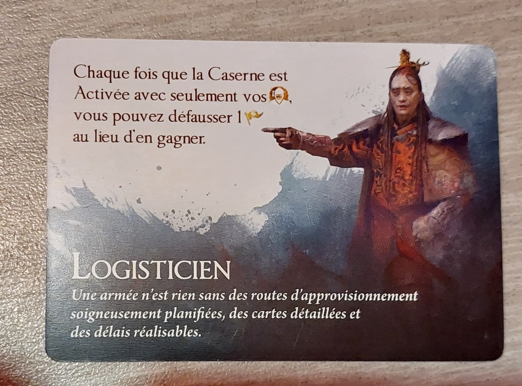 … qui gagne une tactique gratos à chaque étape de revenus et qui gagne du Chi (qui va l’aider à jouer des Tactiques augmentées) à chaque fois qu’il joue une carte tactique (apparemment une erreur de la VF ?). J’ai essayé d’optimiser mon autre général du mieux que j’ai pu :