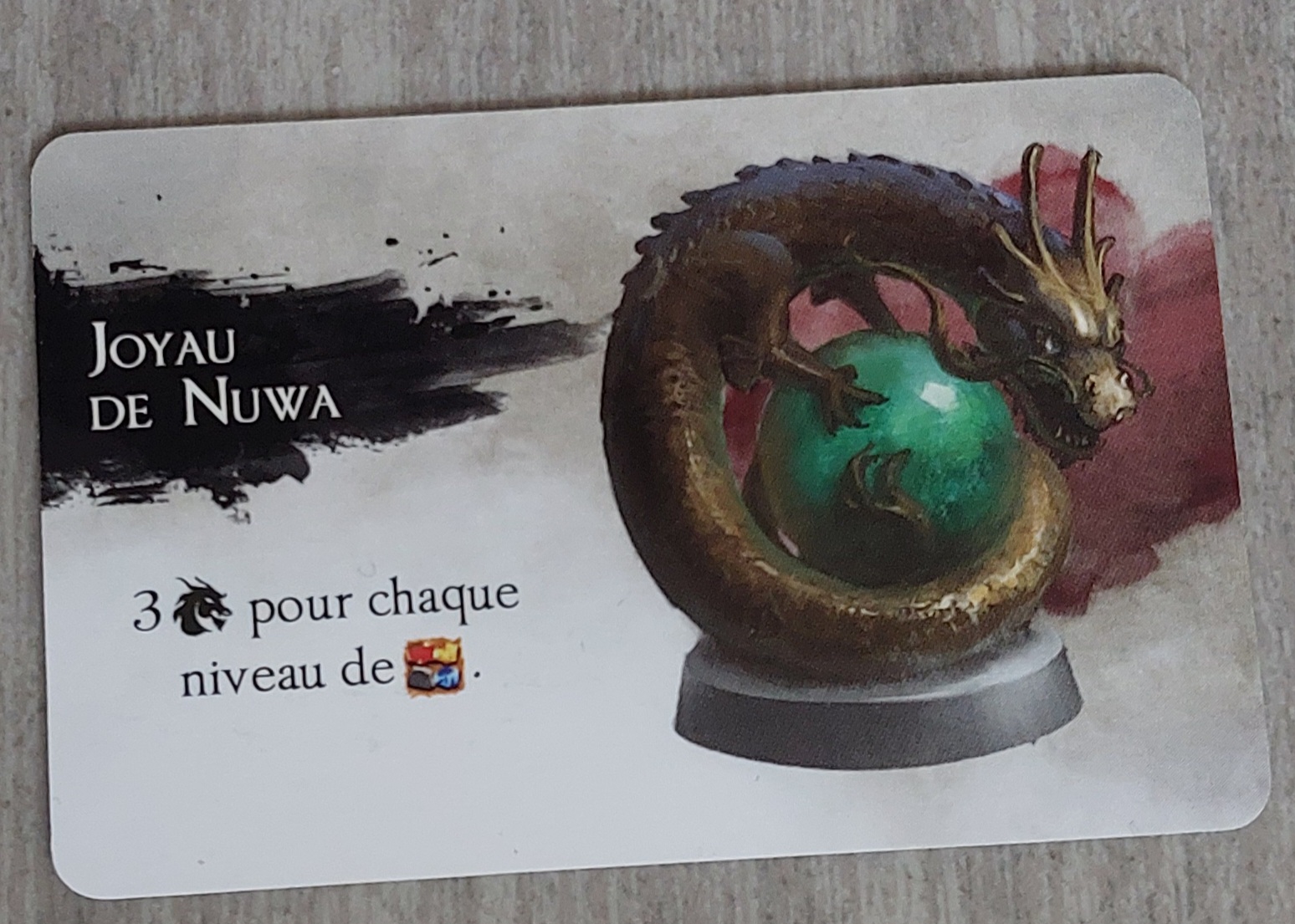 la carte stratégie “Économie” de Qin Jiushao lui permet de monter tous ses contremaître d’un cran (il passe du niveau 1 avec lequel il commence au niveau 2 partout). Suivant le moment où cette carte tombe, la capacité de l’automa a faire des points va être grandement impacté vu qu’il va brusquement doubler les points qu’il fera sur chaque lieu… J’imagine donc facilement des grands écarts de score possible pour Qin Jiushao, écarts seulement dû au hasard d’un tirage, personnellement je préfère les automas qui ont un niveau modulable et “jaugeable”…