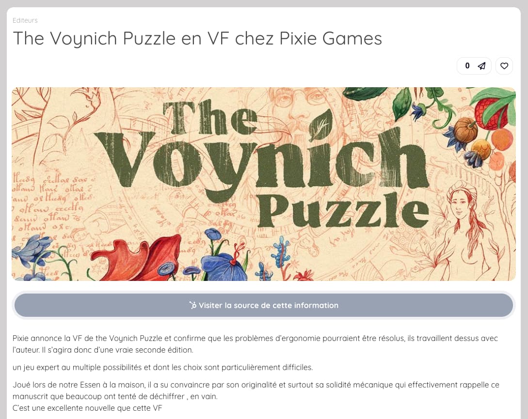 The Voynich Puzzle est un jeu expert créé par Dani Garcia, produit par un éditeur peu connu Salt & Pepper Games via par la plate-forme de financement participatif Gamefound. Bien qu’à ce jour il n’y ait pas de version disponible en boutique, j’avais envie de vous parler de ce jeu qui a été un coup de cœur de la fin d’année 2025