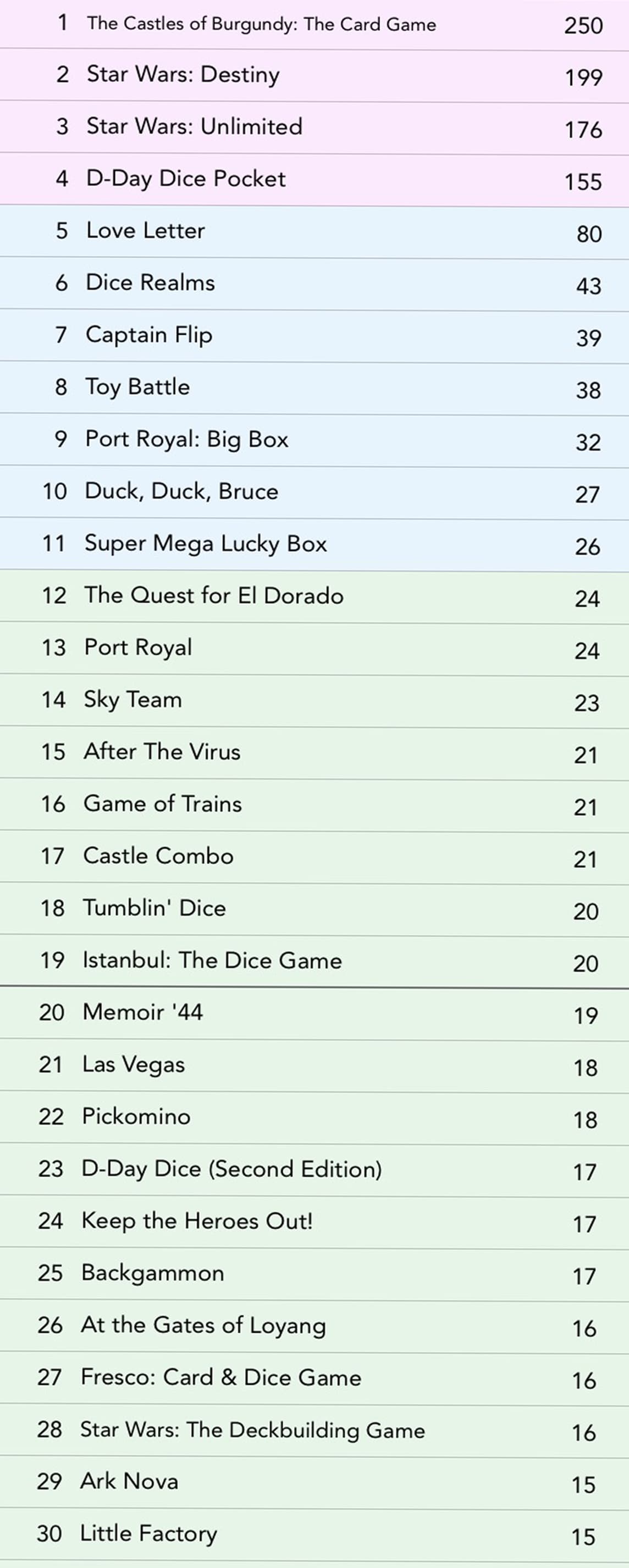 Je vais avoir du mal à me débarasser du Uno en tete des vertes années de junior, mais pour le reste Schotten-Totten progresse. Hadara rentre dans mon top 20. 7 wonders duel rentre enfin dans le top30, Bazar Bizarre et Agricola Terres d’élevage en sortent.