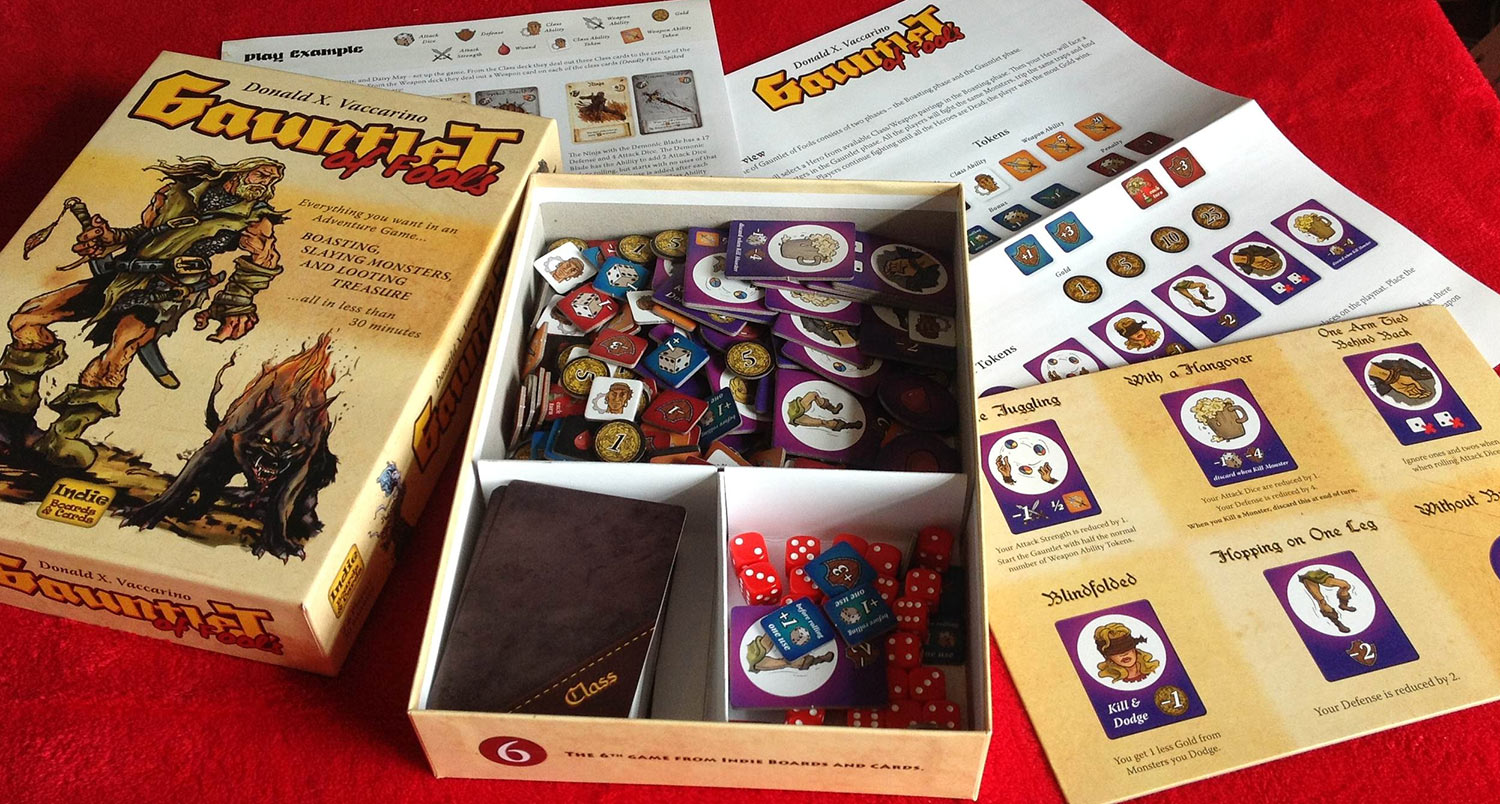 -Gauntlet of Fools VO 18€ : Cartes protégées, pions en sachet, un petit “pète” sur une arrète mais pas dans un coin