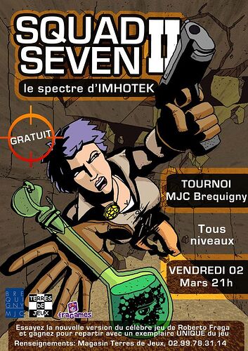 Après le OFF du Festival international des jeux de Cannes en février 2011, Festival des jeux de Toulouse en avril 2011 et le FLIP de Parthenay (79) le tournoi Squad Seven 2 fait étape à Rennes dans la MJC de Bréquigny le vendredi 2 mars à 21h. A gagner une boîte de Squad Seven 2. Le tournoi est ouvert à tous, expert comme novice, à partir de 8 ans.