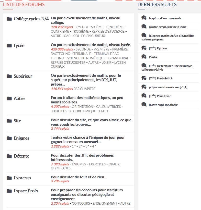 MasterMindM dit :Si je fais abstraction de la grosse banière publicitaire "vente flash", il me semble personnellement naturel que les gros carrés avec les barres colorées (marron pour "on y joue", orange pour "Jeux en financement", etc.) sont les équivalents des sections présentées en liste dans la "liste des forum" de la deuxième capture ("Collège cycle 3/4", "Lycée", etc.)La présentation en 3x3 me dérange. Les titres des catégories ne sont pas hyper clairs (ou alors me semblent tellement inutiles, le problème vient alors de moi et de ce que propose le forum). Le fait d'avoir des "extraits" de sujet juste sous les catégories alourdis énormément la présentation à mon sens.