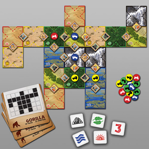 Ensuite, chacun son tour chaque personne lance les dés qui définissent une route à suivre pour le safari (disons des points de passage obligatoires). Sur chaque terrain, le joueur prend une photo d’un animal qui y réside (s’il est encore possible de prendre en photo quoi que ce soit dans la zone dans laquelle il passe. Les animaux étant présents en nombres limités).