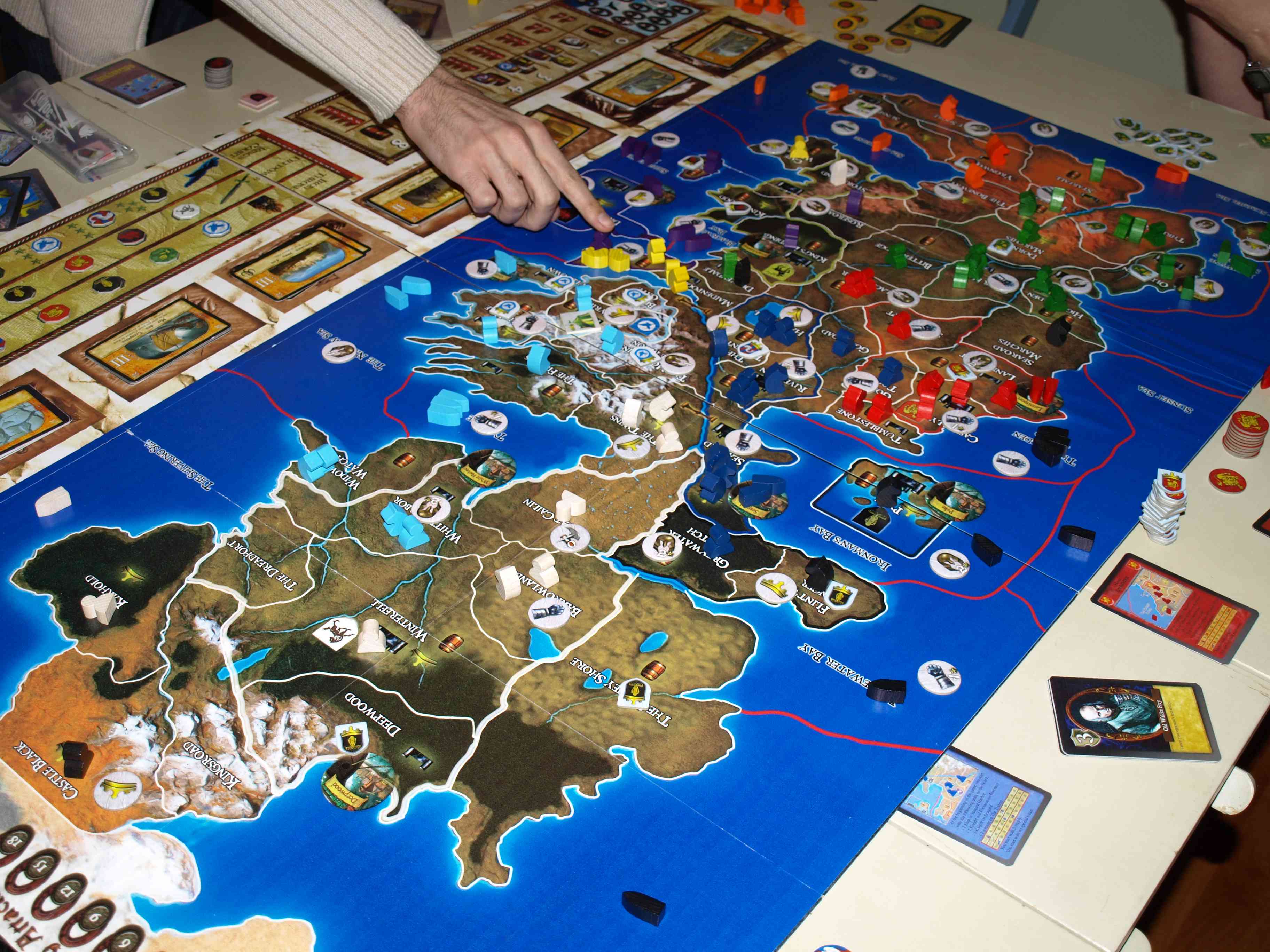 La deuxième en cours de partie. Je trouve qu’elle résume assez bien la partie. Soit un Stark attaqué par le Greyjoy et l’Arryn, mais qui tiend bien. Un Greyjoy qui contrôle 1/3 de la mer, mais pas un pet de terre ferme, un Arryn très développé et à un cheveu de la victoire, un Lannister, après une escapade à Port Réal, repoussé dans ses terres, un Tully aux terres imprenables, mais à la position centrale fort restrictive, un Tyrell très étendu mais à qui il manque peut être un peu de transoprt naval, un Barathéon délogé de Port Réal qui tente de survivre, un Targaryan discret (caché derrière la main) mais fort de 3 dragons, qui gagnera cette partie lors de la venue de l’hiver, enfin un Martell dont je n’ai pas pu vraiment suivre les exploits (trop loin de moi), mais qui n’a pas réussi à s’étendre des masses non plus…