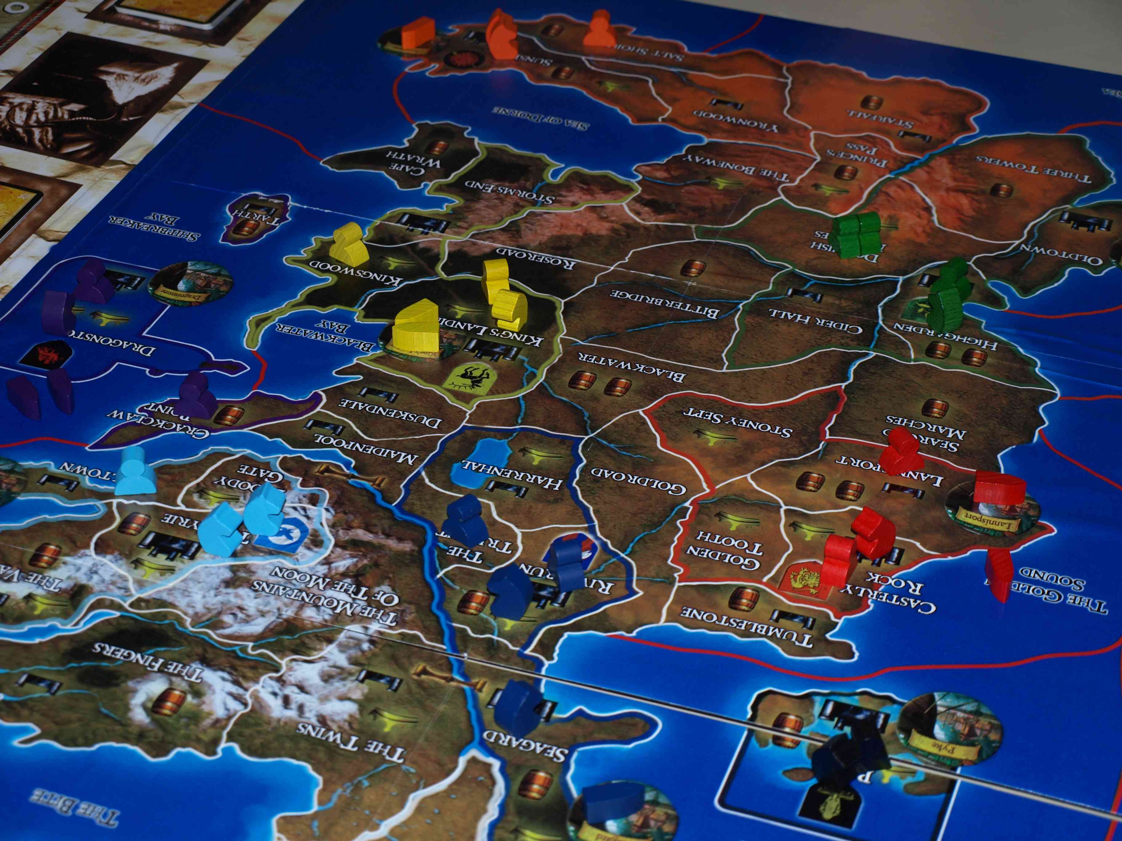 Je jouais Tyrell au sud-ouest, or j’ai eu des insteractions avec 3 autres joueurs en gros, et la majorité de mes batailles l’a été à l’encontre d’un seul et même joueur. Je n’ai eu aucun rapport avec Starck tout au nord, ni avec beaucoup d’autres joueurs: je me contentais de regarder les mouvements de leurs pions sans avoir la moindre possibilité d’influer dessus. Cette absence d’interaction a même été si loin que durant un tour, nous en sommes rapidement arrivés à faire jouer en même temps des joueurs du Nord, et d’autres du Sud.