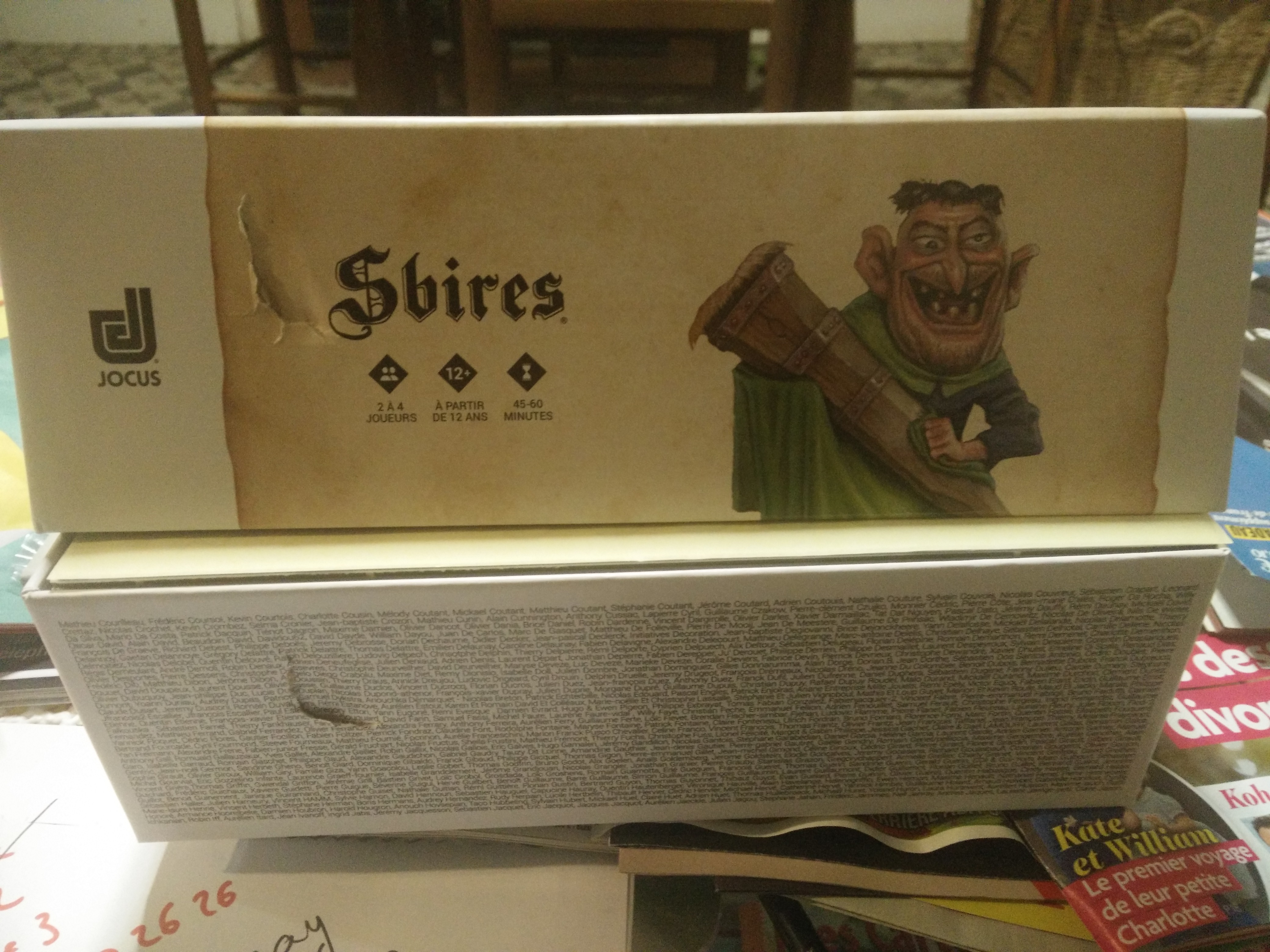 De mon côté, j’ai bien reçu mon exemplaire courant de semaine dernière (yeepah). La boîte est splendide, le matériel de qualité (j’adore les dés “sbires”), la dédicace manuelle des Sbires (merci !!!), les noms sur la boîte (encore merci), tout est super ! Seul minuscule bémol : un coup de cutter sur la tranche du couvercle de la boîte. Pas de bol.