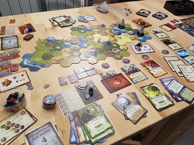 Une partie de Caverna à 2 joueurs et une défaite également … 1h30 de partie (première partie), un très bon Uwe Rosenberg … les défauts sont un temps de rangement et de mise en place important, un vrai challenge pour tout faire rentrer dans la boite ! le remplissage des ressources des emplacements pour les ouvriers …