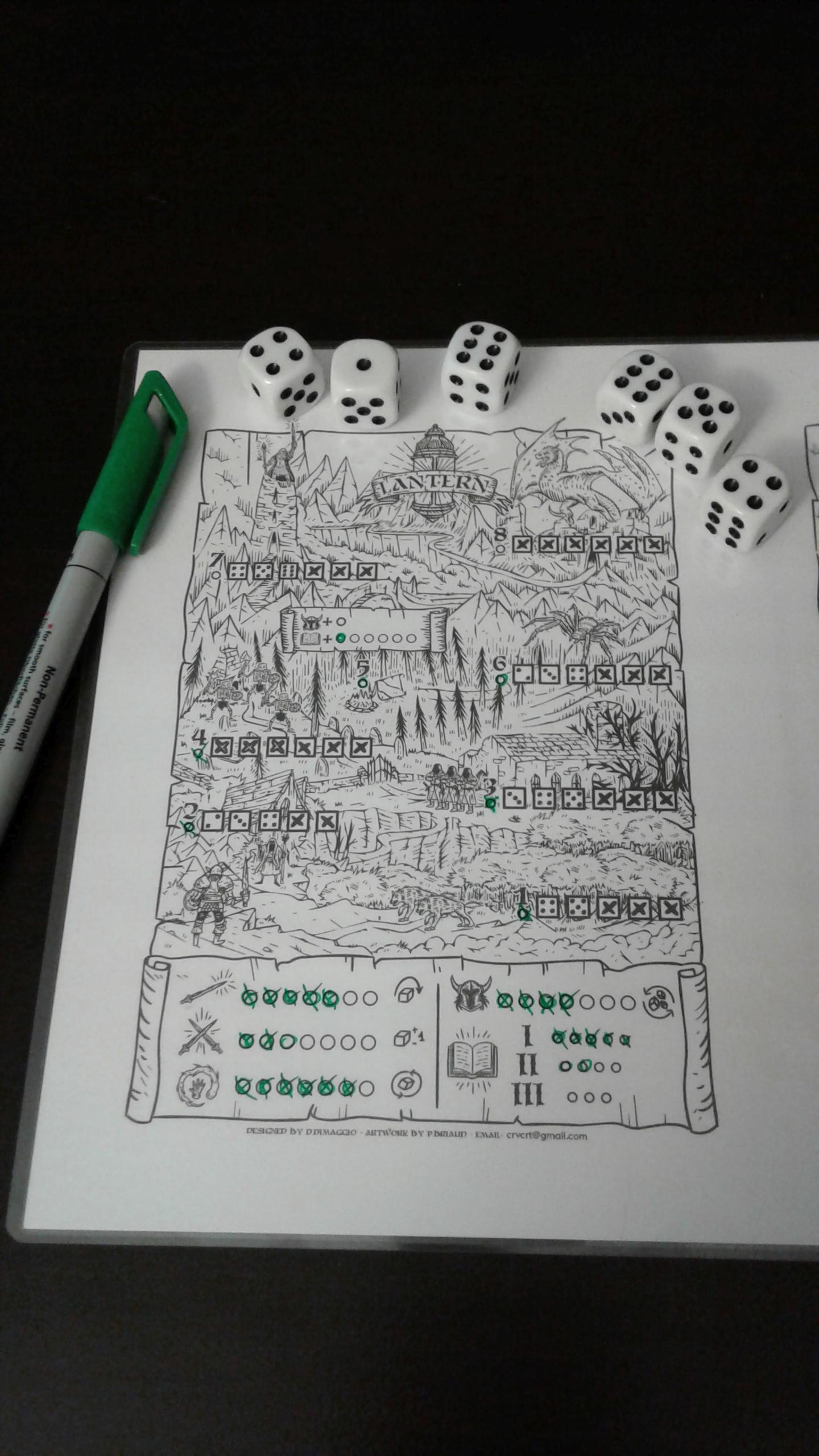 Dans la série des PnP solo facile d’accès (en règle et en matos) : Lantern. 6 dés pour arriver à bout des 8 lieux et sortir vivant de cette épique aventure !