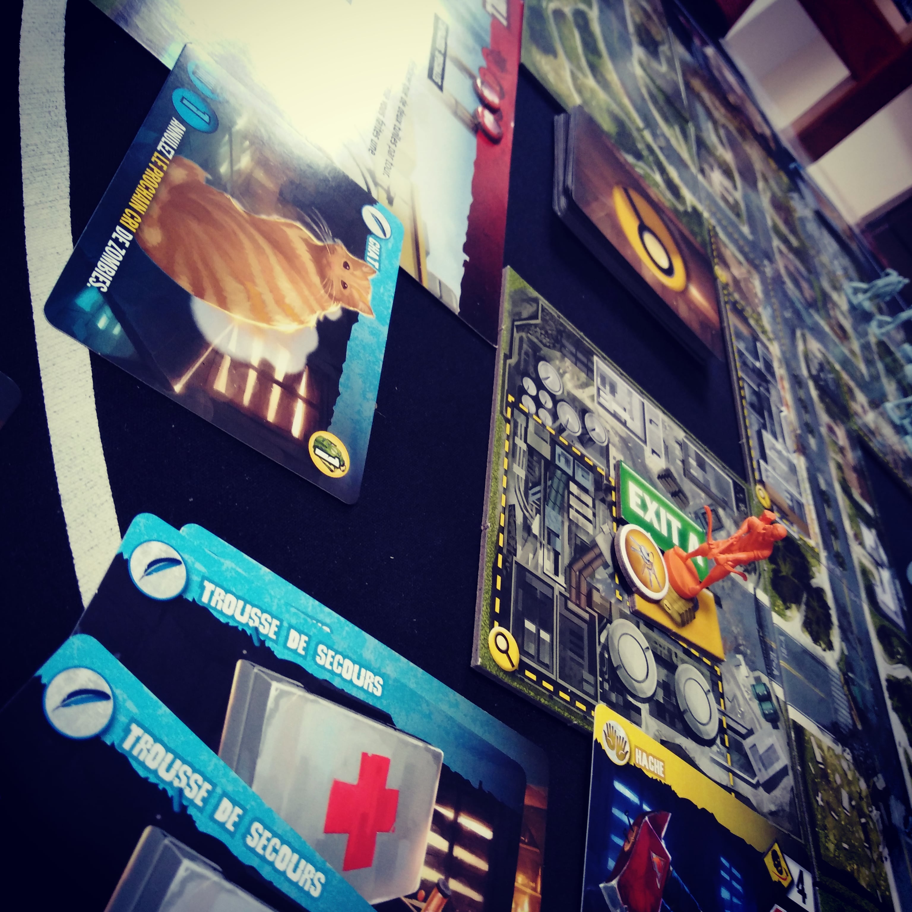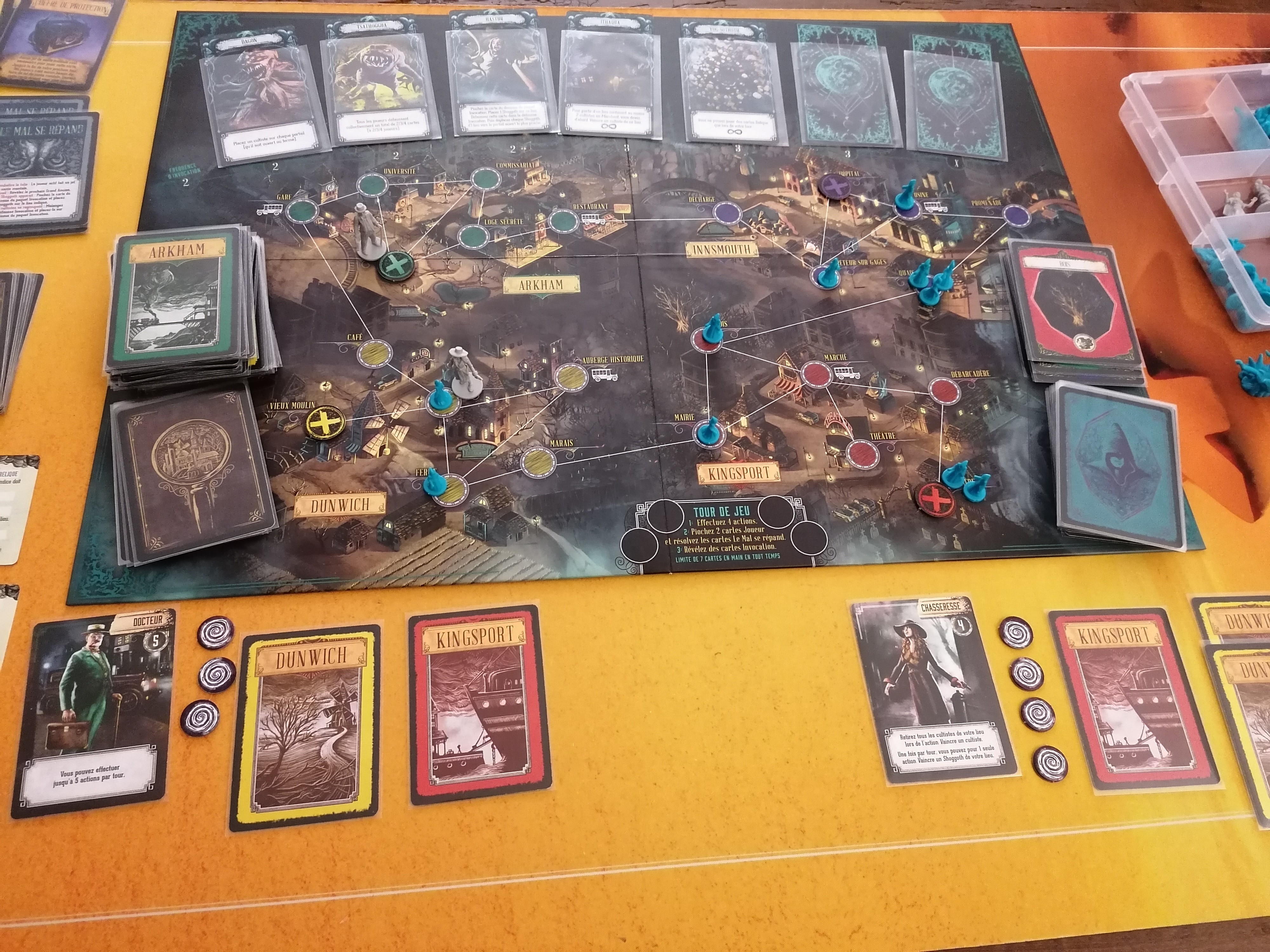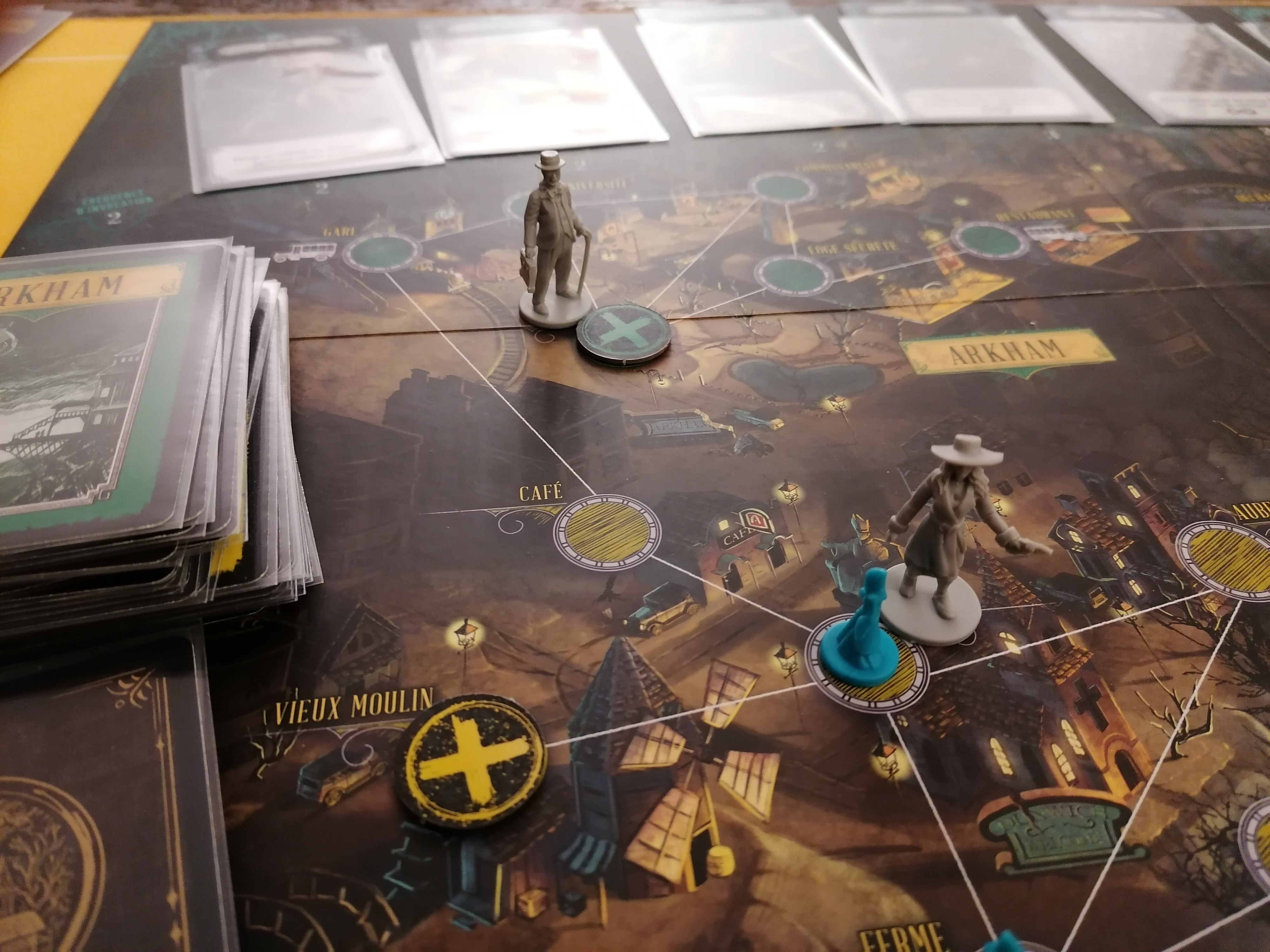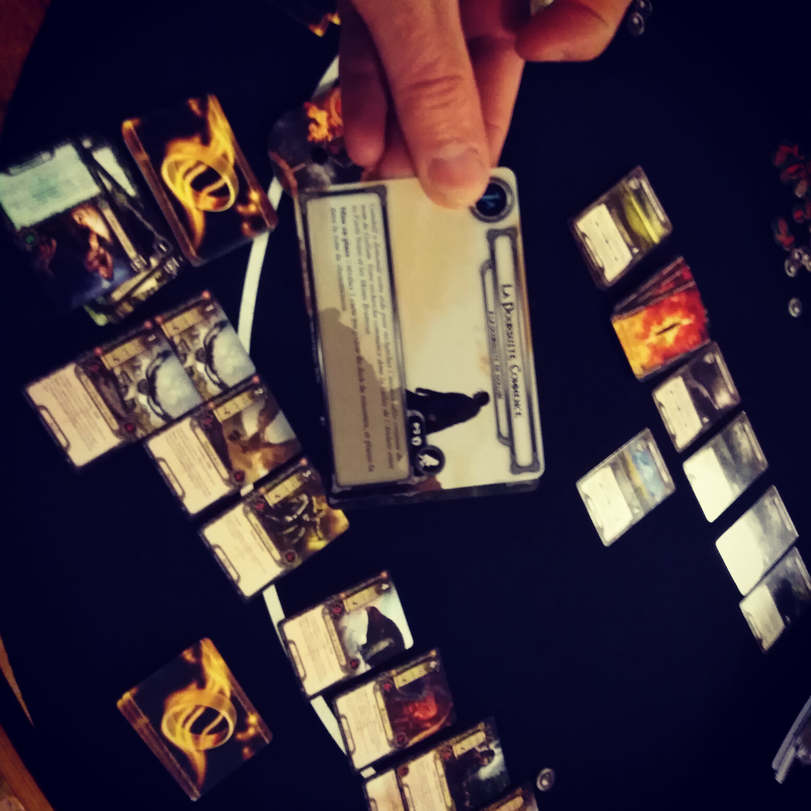 Oui on a repéré sa trace mais le bougre s est enfui, il fait continuer notre traque avec le scénario 2. Bon faut dire qu on joue en mode archi facile Avec mon garçon. On ne met pas les cartes dorées dans le deck rencontre et on commence avec 3 "sous" sur chaque perso dès la mise en place. Ça facilite les choses 😉😁