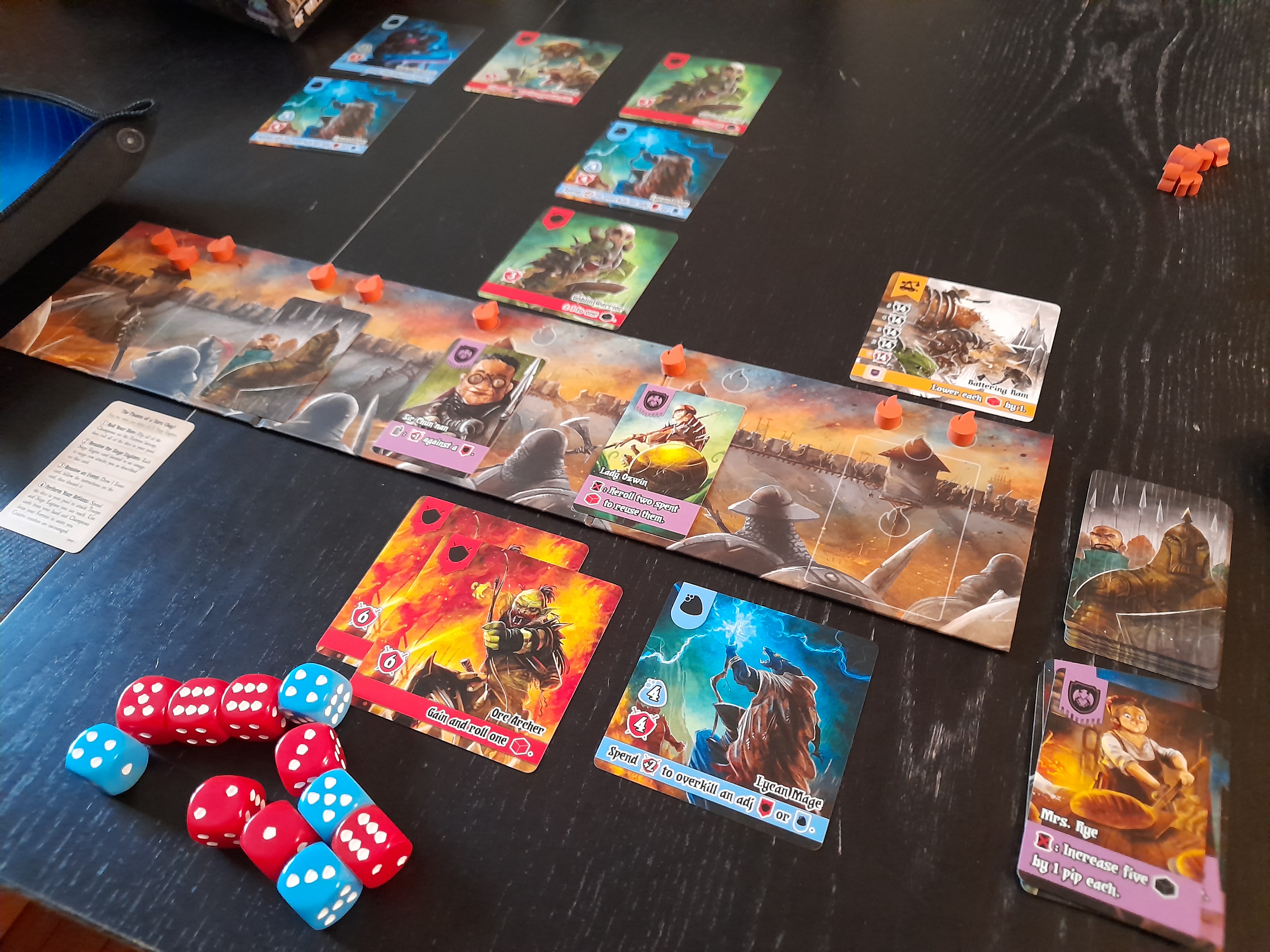 - dice-building : avec l'argent collecté tu peux acheter jusqu'à 2 dés supplémentaires. Tes dés achetés vont dans la défausse ainsi que tous les dés actifs de ce tour. Lorsque tu dois recréer ta pioche et qu'il n'y a plus de dés alors tous tes dés de la défausse redeviennent disponibles.