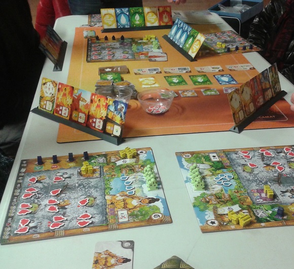 C’est très coloré mais je n’étais pas à cette table, donc je ne peux pas en dire grand chose. Simplement que la partie n’a pas été à son terme (construire 5 villages) mais qu’elle a été bien appréciée des participants.