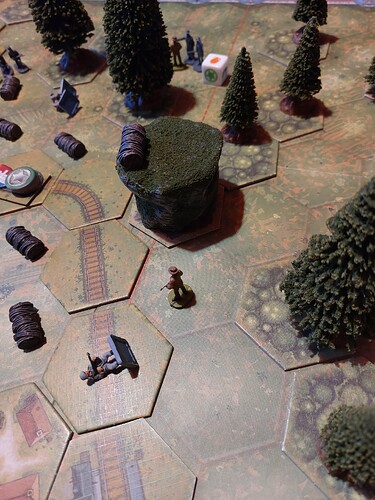 Mémoire 44 sur un scénario inventé par Krrro jr : mes allemands peinent à protéger le train face à cette armée de l’ombre tapie dans la forêt…