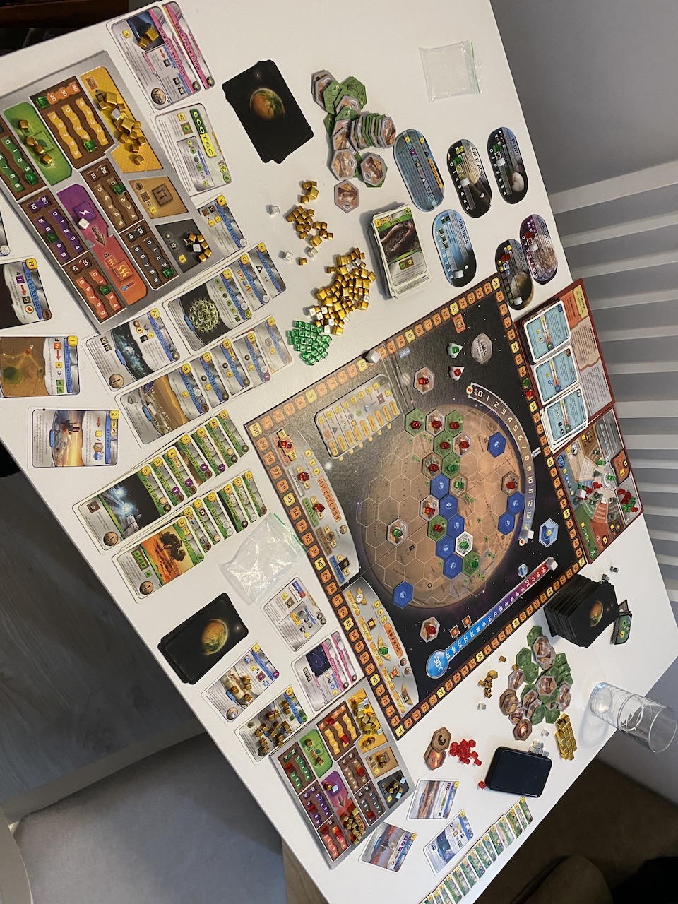 Projet Gaïa + extension : malgré pas mal de business de jetons de puissance avec les Taklons, mes Nevlas ont du mal à démarrer, n’ont pas assez profité des bonus de manche et n’ont pas réussis à prendre une tech avancé “gros bill”, les Moweyds passent devant grâce notamment à une très bonne optimisation des bonus de manche, les Taklons sont à la traîne mais c’était leur 2ème partie, ils se sont bien défendus, chouette partie avec cette extension qui ne révolutionne pas le jeu mais qui lui apporte pleins de petits suppléments sympathiques, on est encore loin des scores des pros et on a déjà mieux joué dans des précédentes parties : 138/127/101 mais c’est toujours un plaisir (trop rare) d’y rejouer à celui ci !
