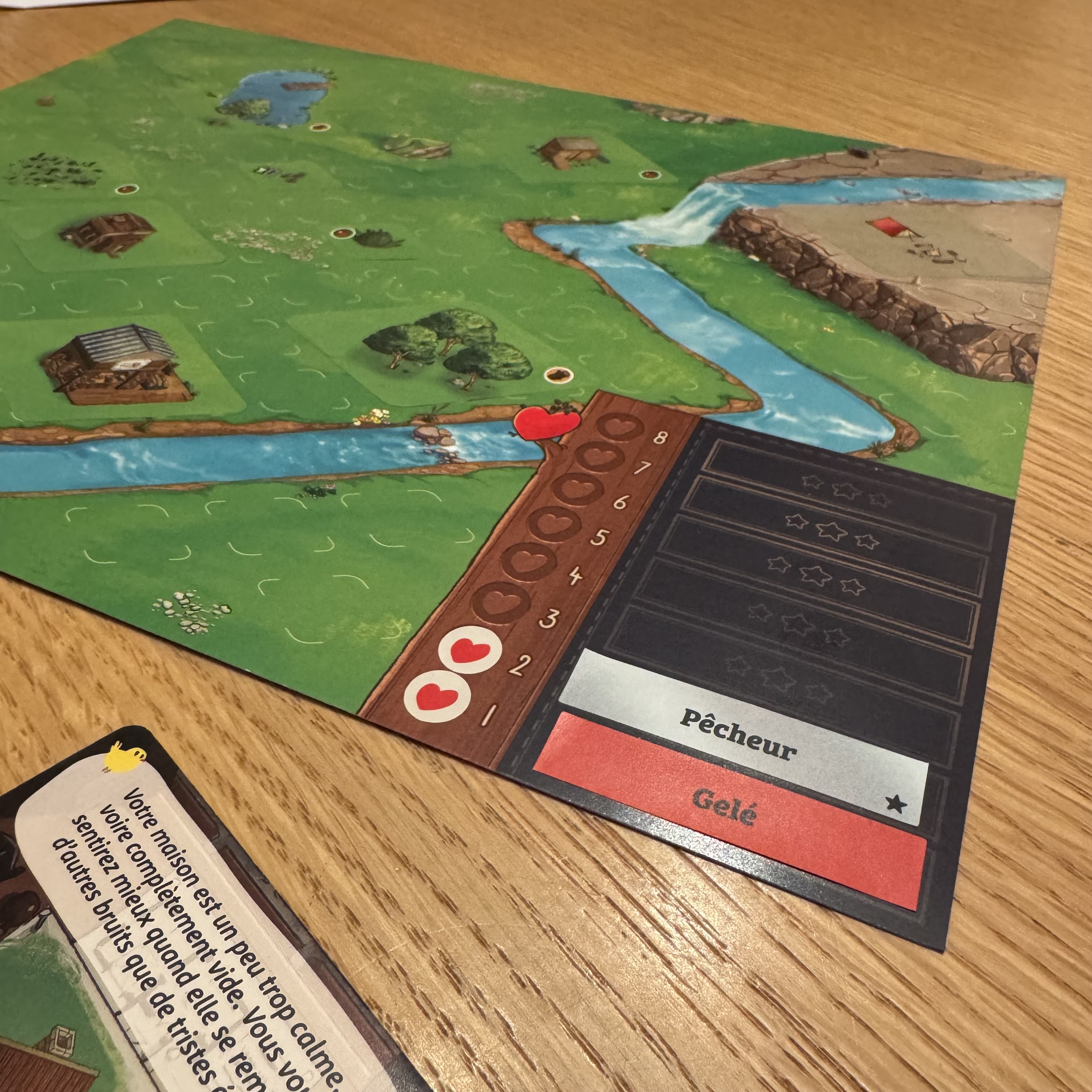 La pochette contenait le matos pour faire deux démo, j’ai fait les deux, une en solo et puis l’autre avec mon 2018, lui a kiffé coller des autocollants et voir son village sortir mais il n’a pas spécifiquement pris à la narration. Ah si, sauf pour aller pêcher et jeter le dé.