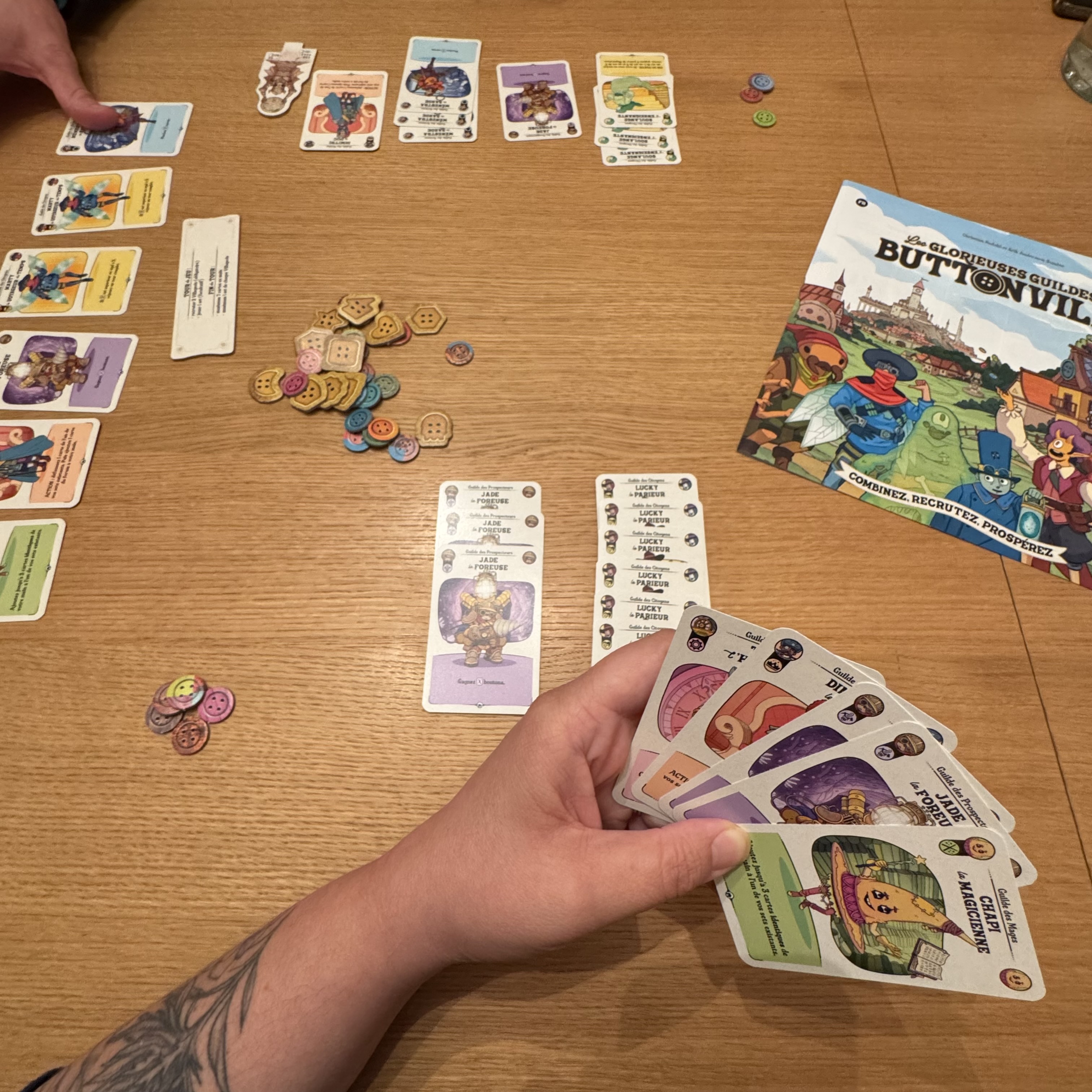 Découverte des Glorieuses Guildes de Buttonville avec le set de départ proposé pour la première partie. Mouais, vivement qu’on le teste avec les autres sets dans la boîte, ils me paraissent plus nerveux.