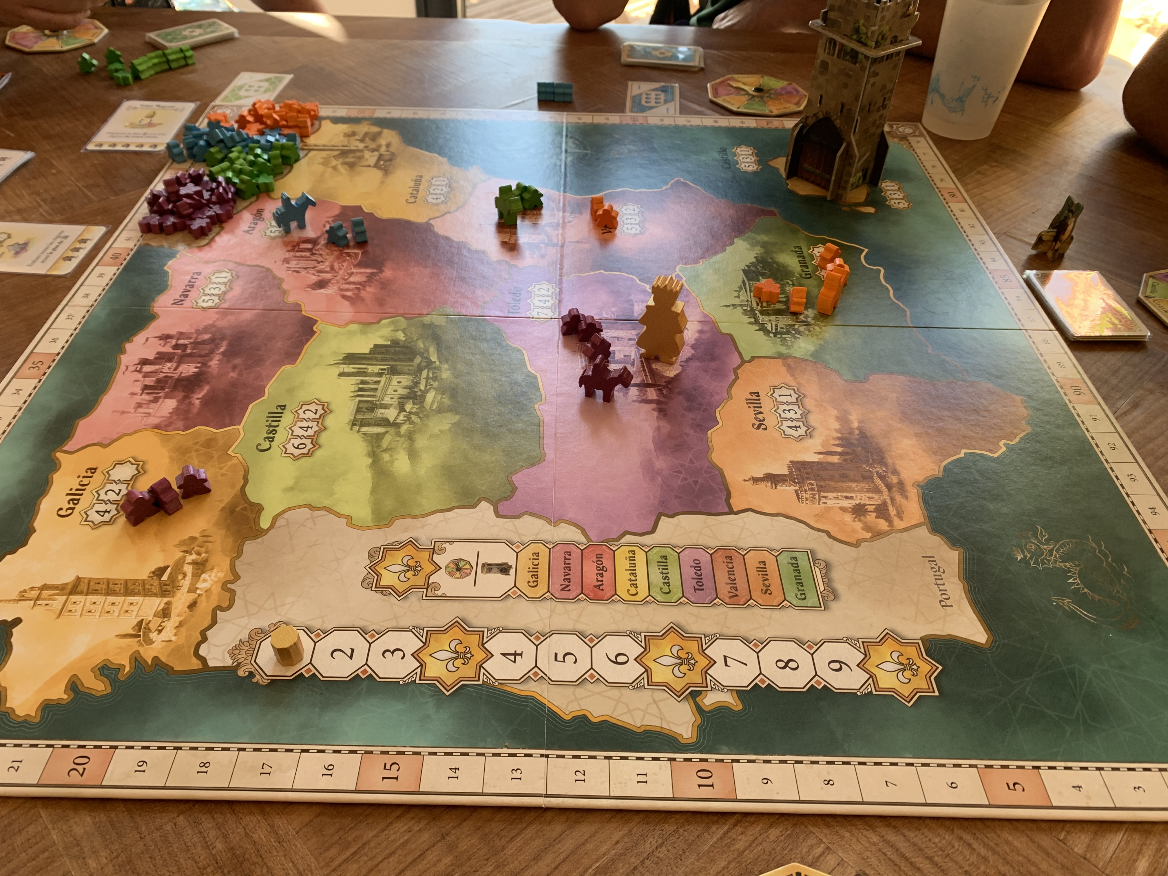 Castillo sous tension permanente ! Les palabres m’ont perdu mais les copines de tables ont bien compter ! Fin de partie, le violet s’est envolé à plus de 100 points. Le vert s’est fait massacré par le bleu qui était à -15pts du violet. Le orange a rattrapé son retard sur le bleu avec un coup de maître, en laissant la dernière carte disponible « évaluer les points du Castillo » au dernier joueur à jouer et en plaçant tous ses Caballeros dans le Castillo. Très bon timing.