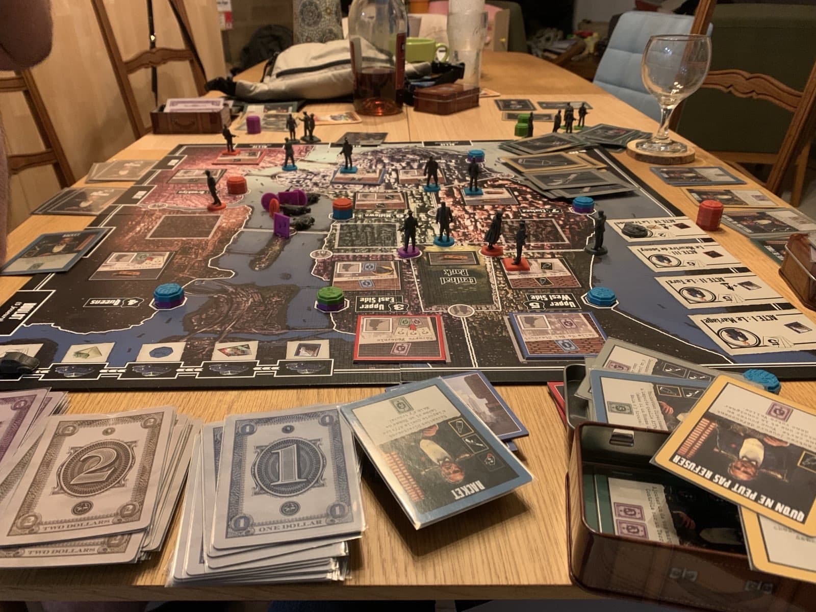 Toujours très étonnant ce jeu et quel plaisir de rejouer à cette véritable pépite trop rarement citée. Il repose sur des mécaniques de majorité, de coups bas et de corruption, où l’on manipule fonctionnaires et argent sale avec une délectable immoralité. Les retournements de situation y sont constants, pas de “Castillo”, comme dans “El Grande”, mais un enchaînement de manigances, de rackets direct/indirect et de trahisons à tout-va pour réunir les ressources nécessaires pour faire les « sales boulots ». Une expérience aussi tendue que jubilatoire, qui nous plonge pleinement dans l’univers du Parrain, un jeu et une œuvre d’une efficacité redoutable…
