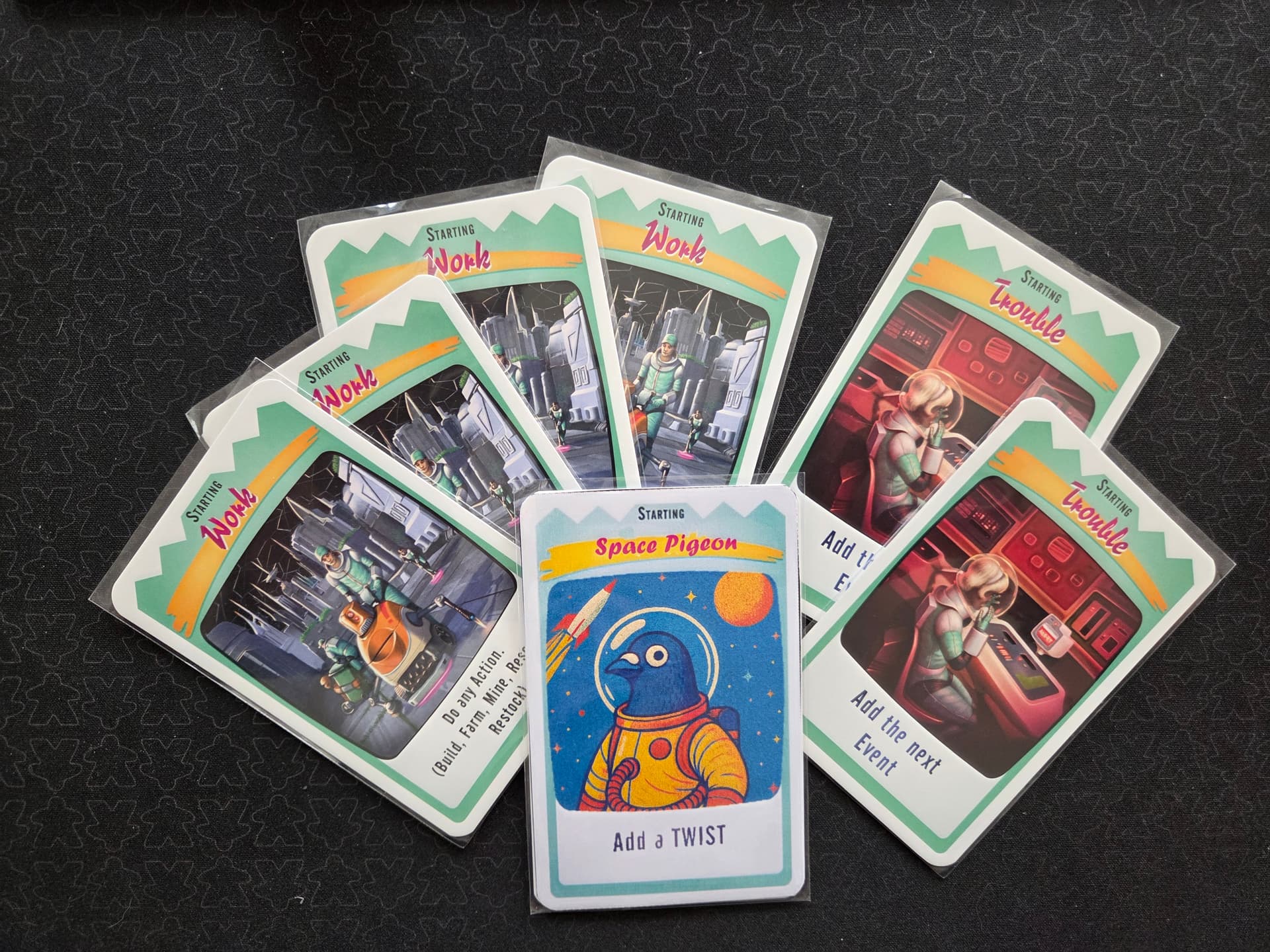 Mise en Place : On remplace les 2 cartes Twist de départ par la carte Space Pigeon et GO