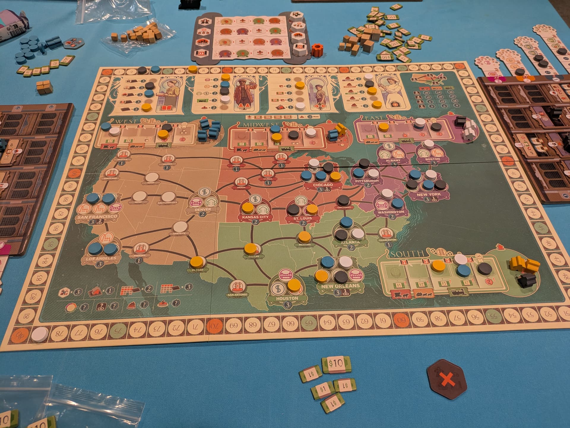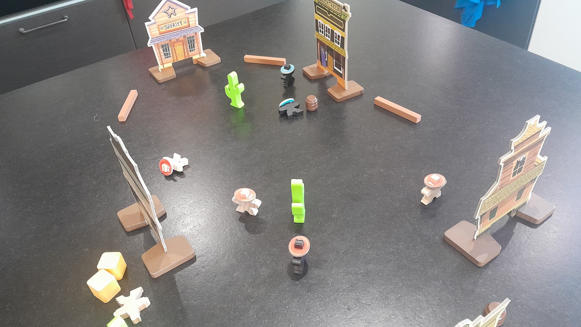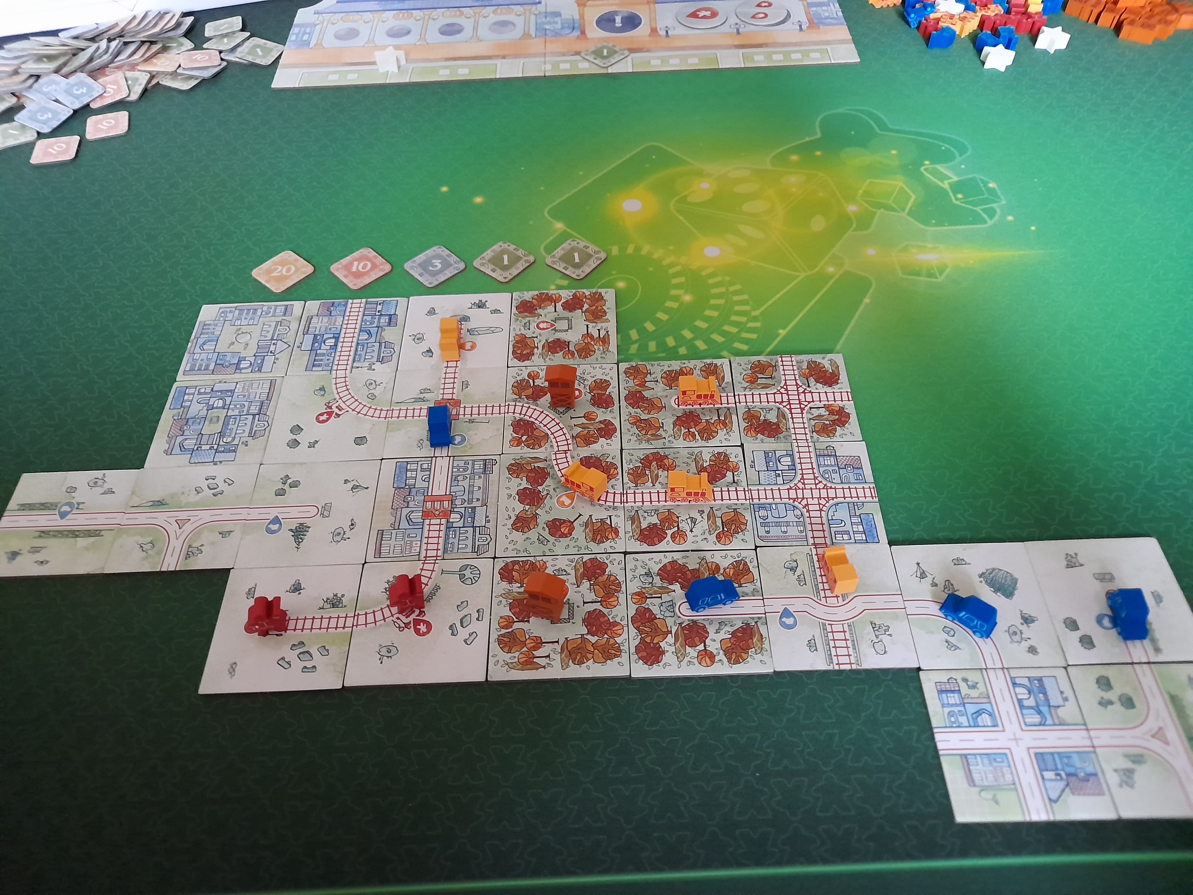 On est chercheurs d’or et ça se sent. Il y a de l’aléatoire (on creuse dans les montagnes et on ne découvre qu’à la fin le nombre de pépites recoltées) et on peut se faire des crasses (annuler le bonus loco en en plaçant une deuxième sur le chemin des autres, ou creuser chez les autres en plaçant sa tente). Ça a bien pesté autour de la table, pas sûr de proposer Carson City tout de suite moi… Victoire de moitié 100-87-67