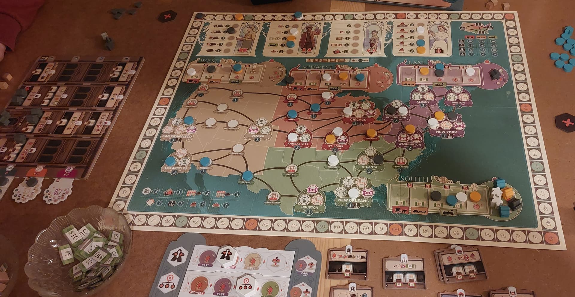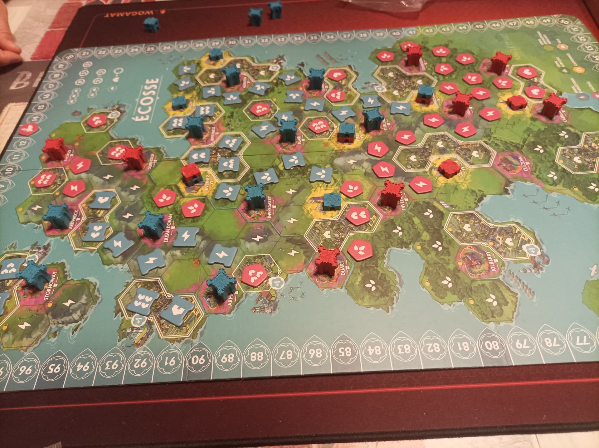 Carnegie : P murmure “mmm je crois que j’ai compris comment foutre en l’air la partie”… Et les disques de constructions s’accumulent vainement chez tout le monde alors que P se gave sur la carte, D le talonne en faisant assez tôt du moteur de points de victoires et des bons choix de donations, je fais l’erreur de ne pas revoir mes plans suffisamment en profondeur et me plante sur une donation, C et moi nous prenons une vingtaine de points dans les dents… 128/126/109/105, toujours aussi bon ce Carnegie !