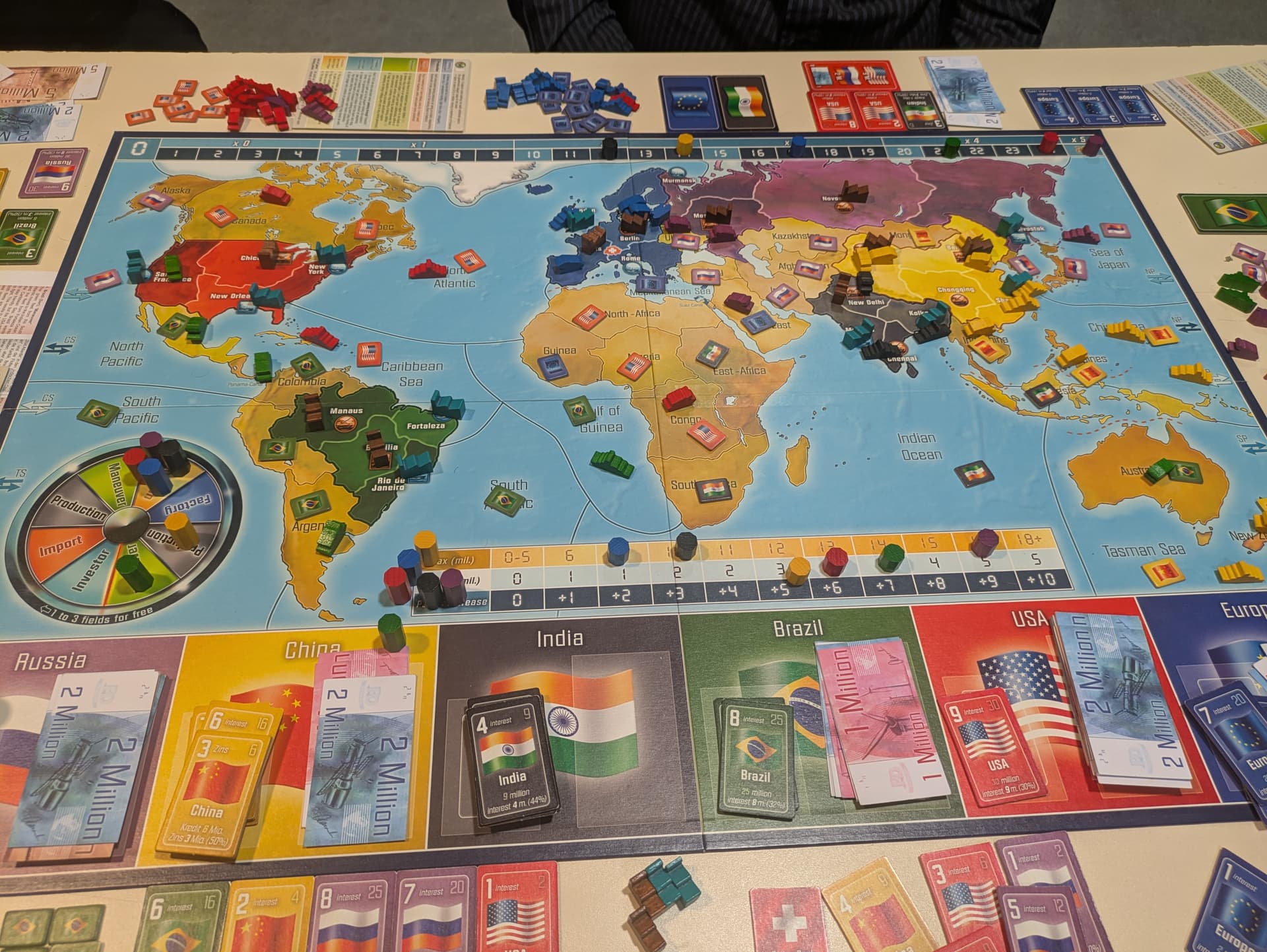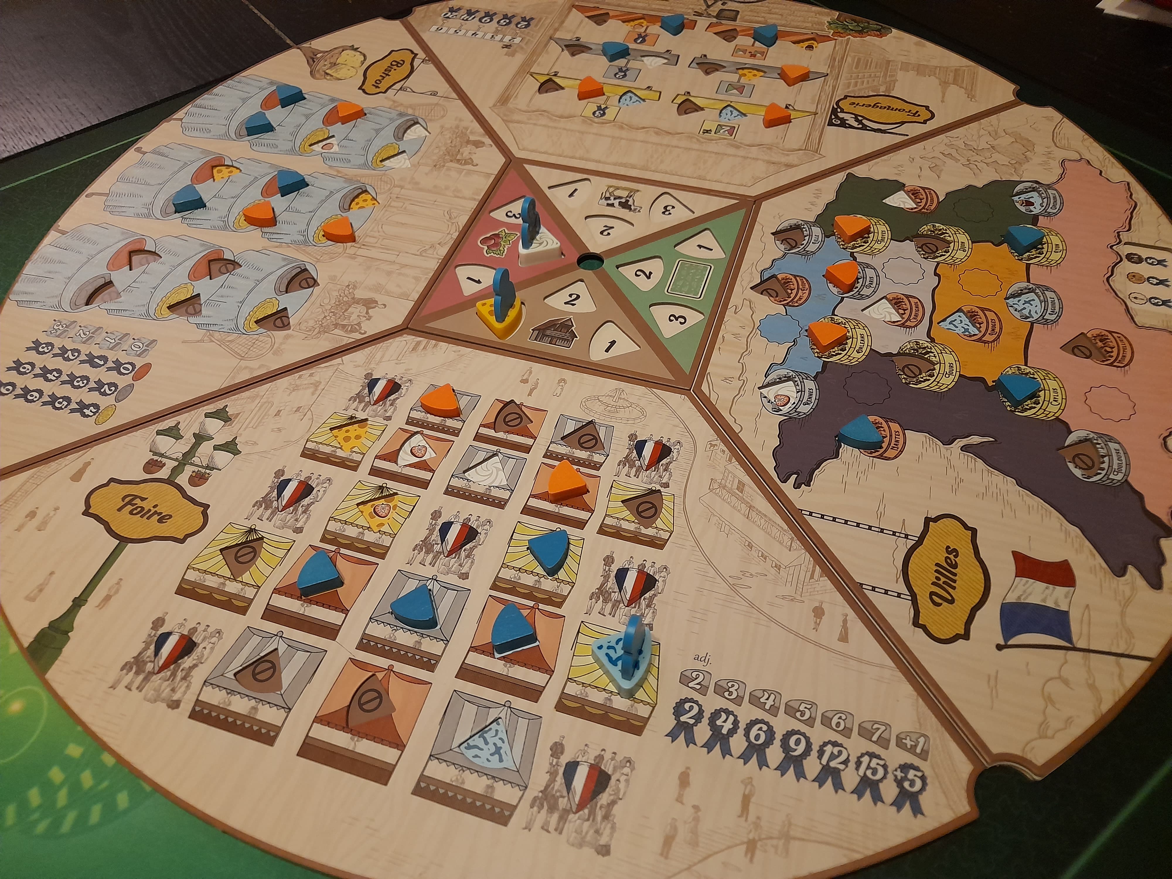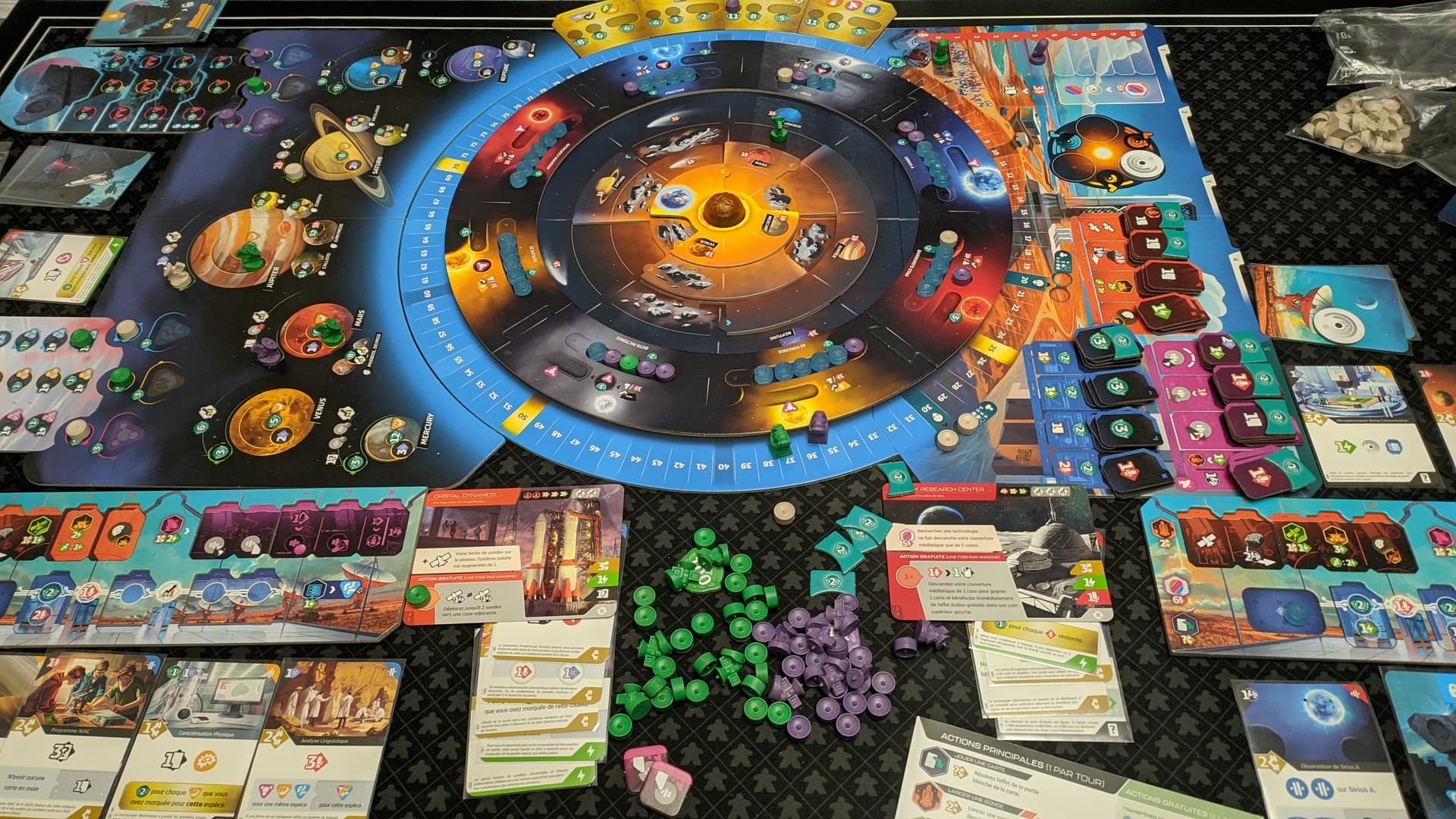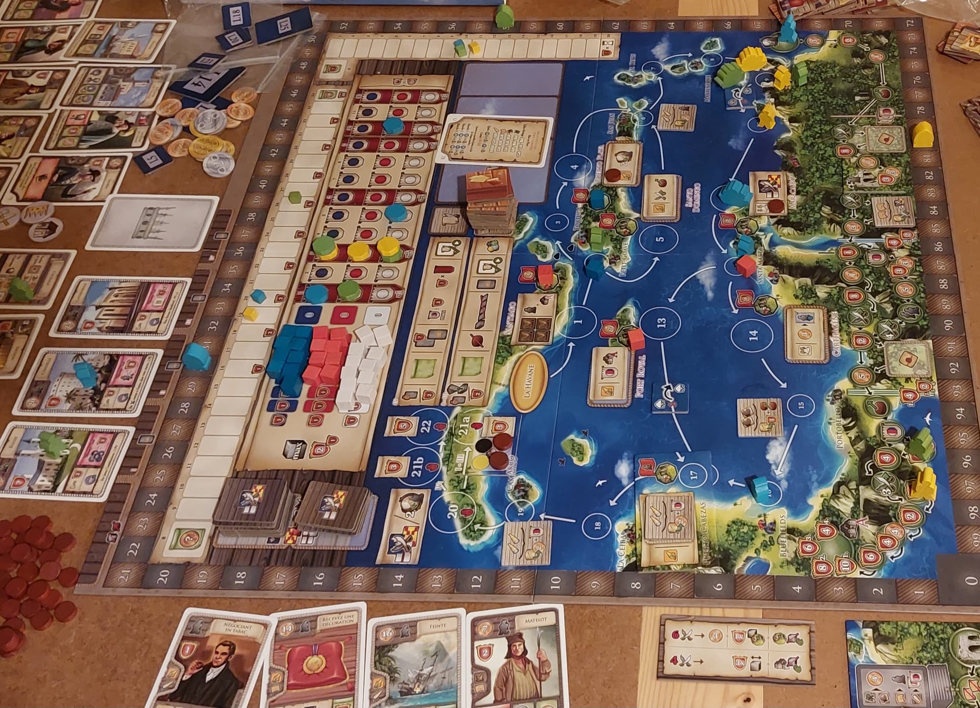 Maracaïbo : ça livre des trucs, ça explore, ça combote parfois fort, ça essaie de gérer sa main, ça réfléchi influence des nations, ça réfléchit timing… D, le plus guerrier d’entre nous n’a pas trop été suivi et finit en queue de peloton, C n’en finit plus de jouer des cartes, je tire la bourre à C sur l’exploration avec un pouvoir bien “cheaté”, on finit 1er ex-aequo, c’est quand même vraiment sympa Maracaïbo ! (Mon préféré de Pfister perso par contre l’installation… )