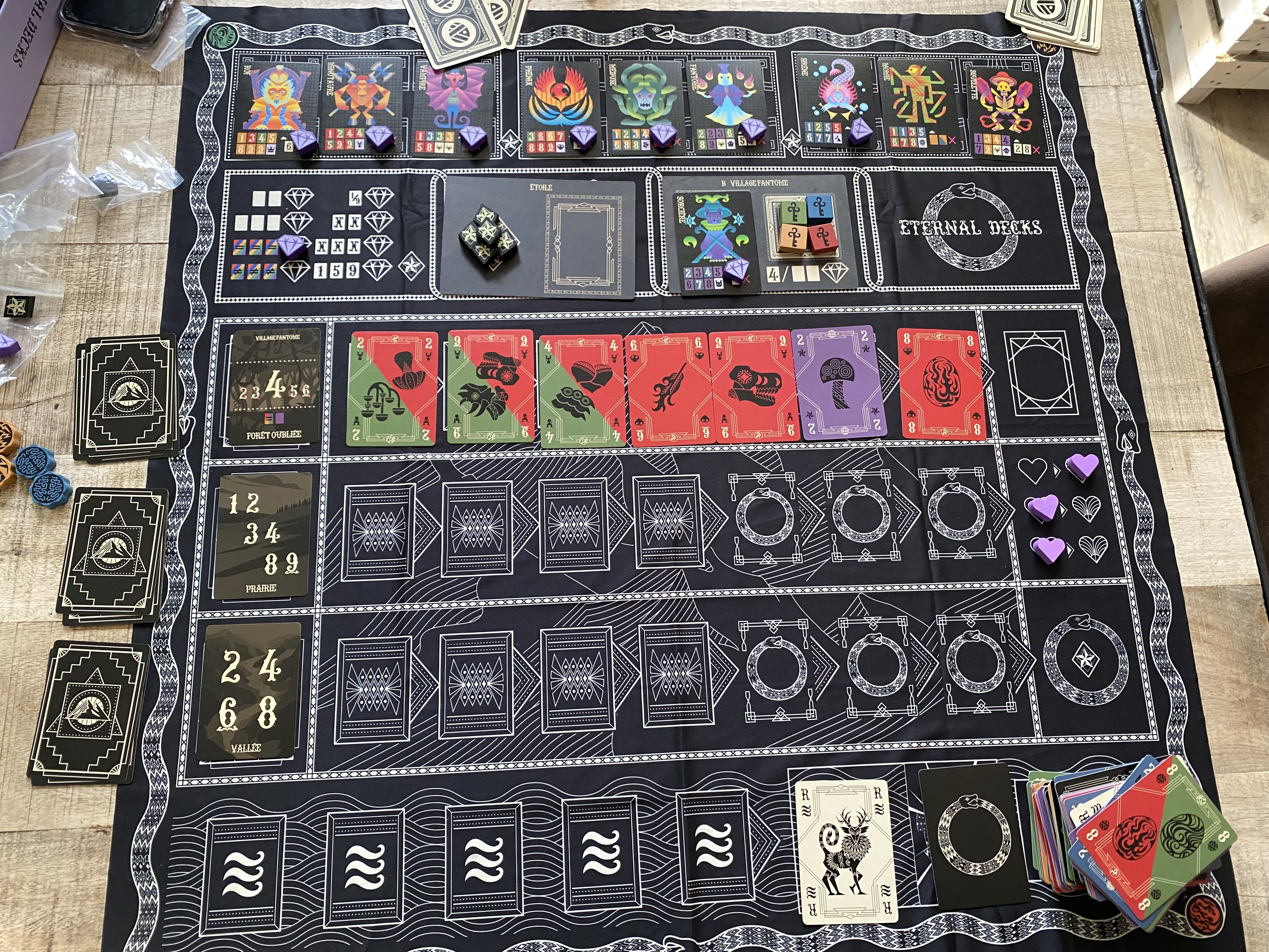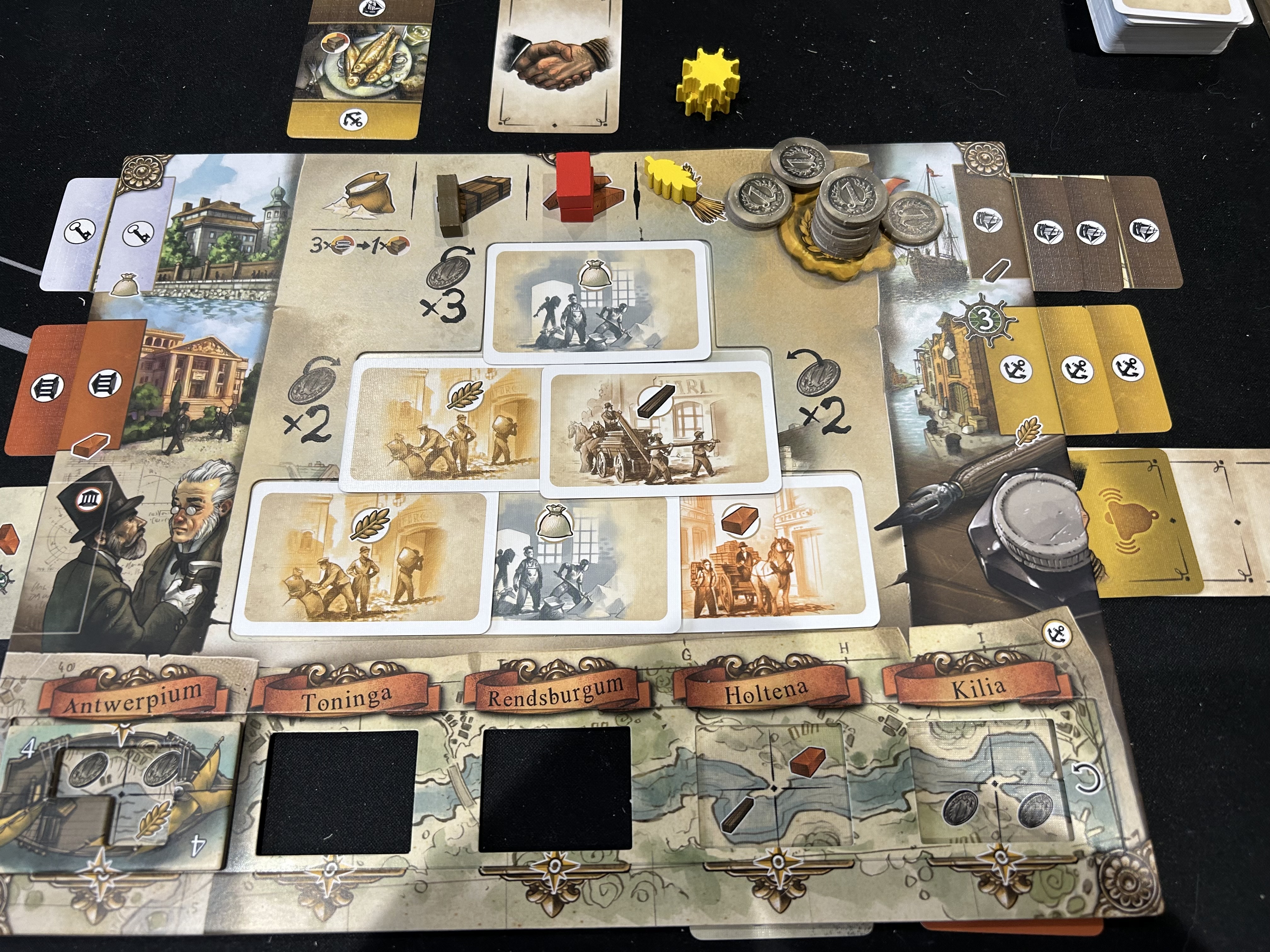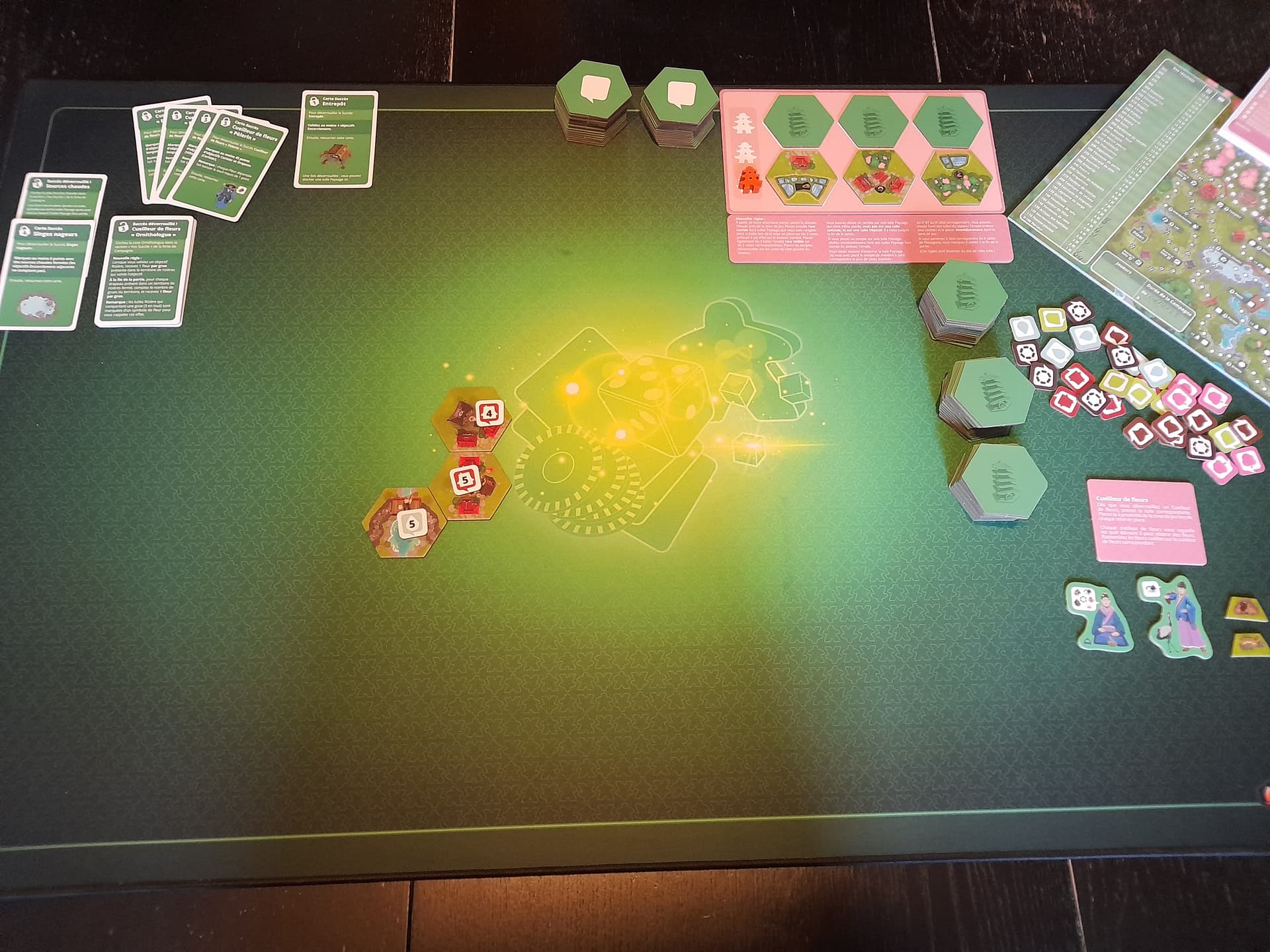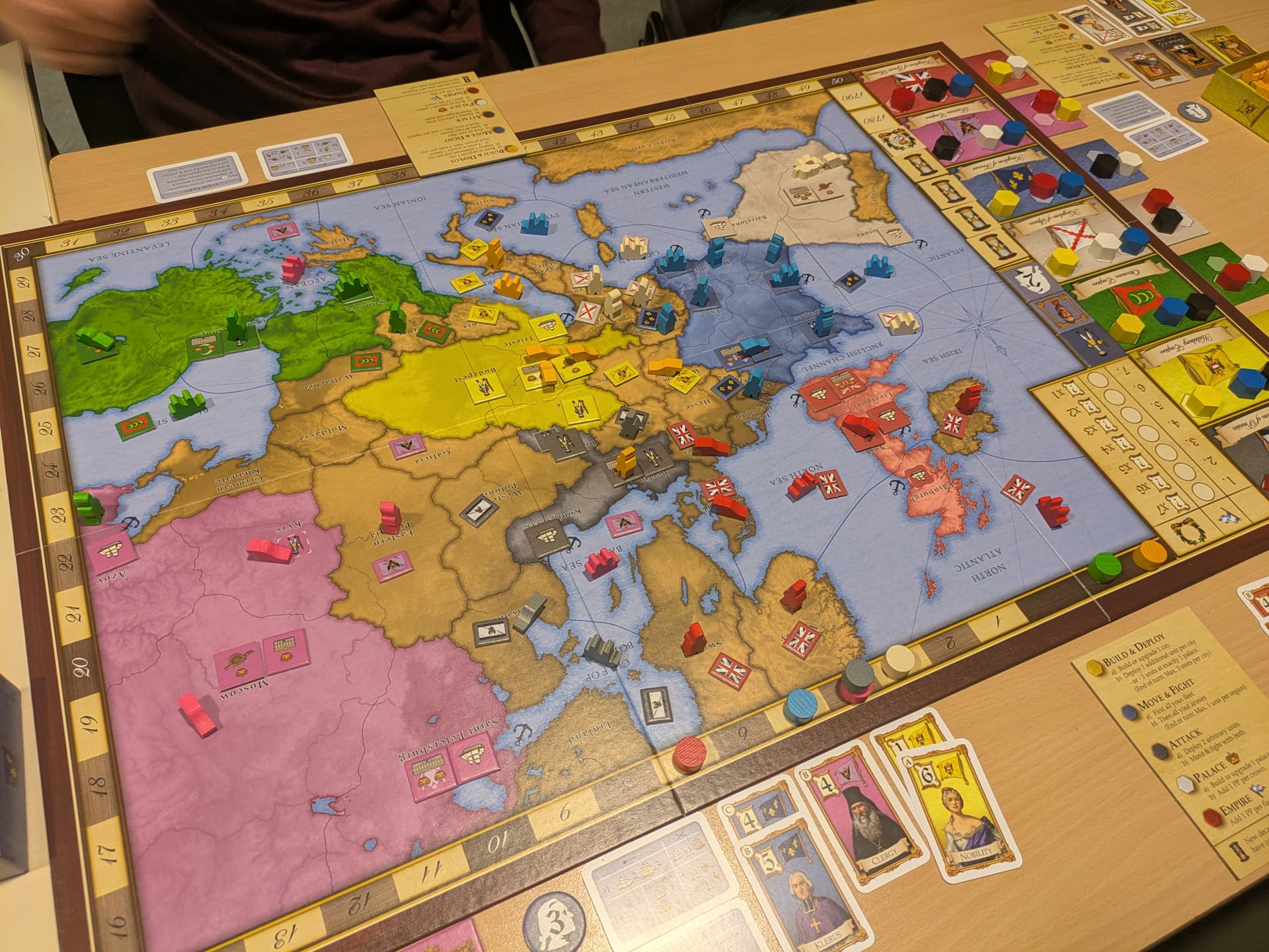 Maracaïbo : ça livre des trucs, ça explore, ça combote parfois fort, ça essaie de gérer sa main, ça réfléchi influence des nations, ça réfléchit timing… D, le plus guerrier d’entre nous n’a pas trop été suivi et finit en queue de peloton, C n’en finit plus de jouer des cartes, je tire la bourre à C sur l’exploration avec un pouvoir bien “cheaté”, on finit 1er ex-aequo, c’est quand même vraiment sympa Maracaïbo ! (Mon préféré de Pfister perso par contre l’installation… )