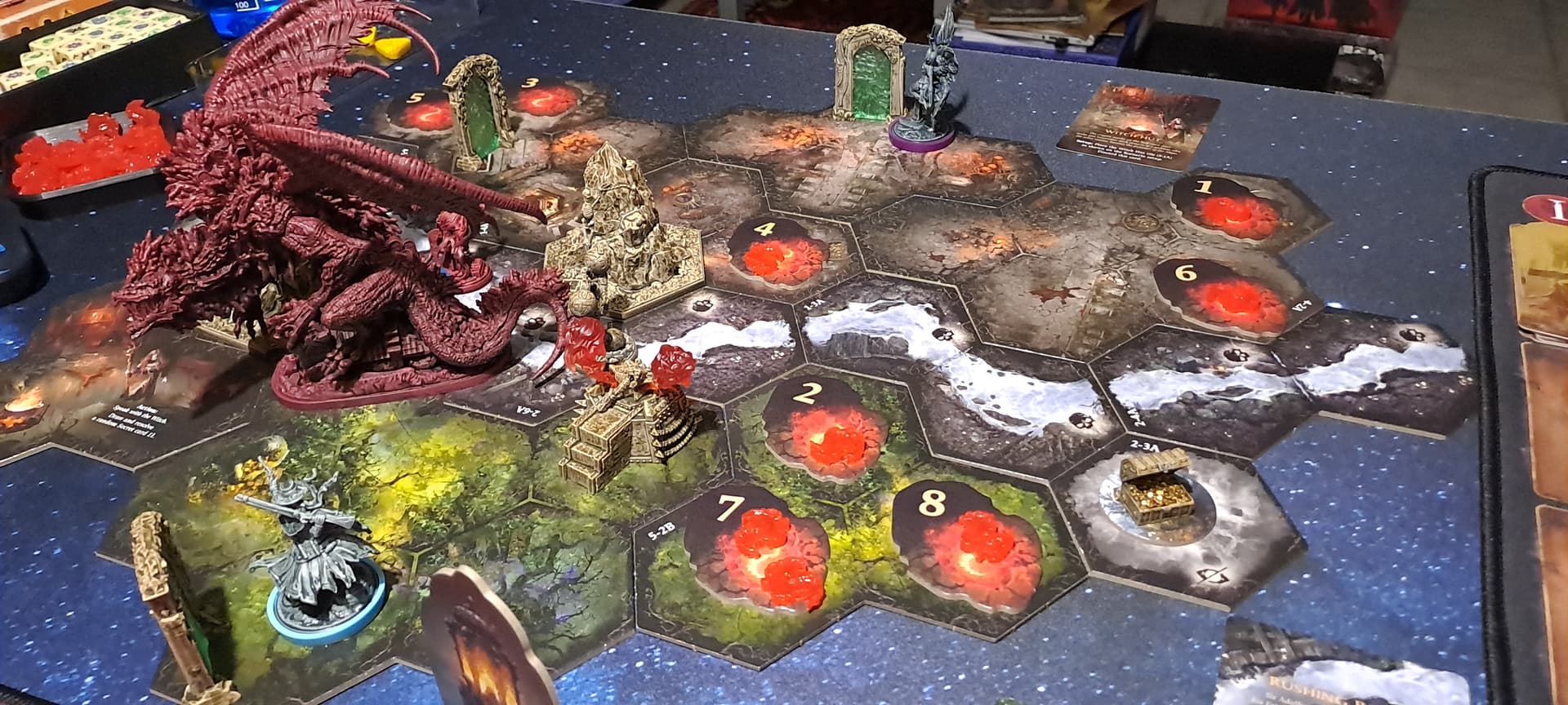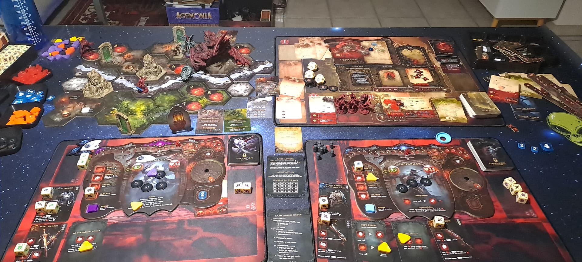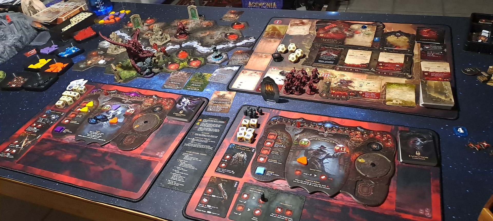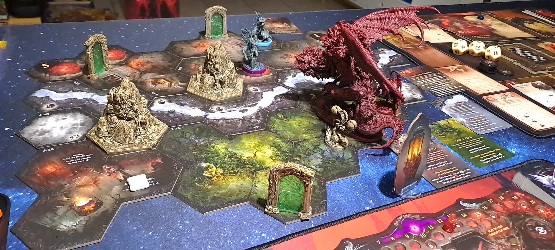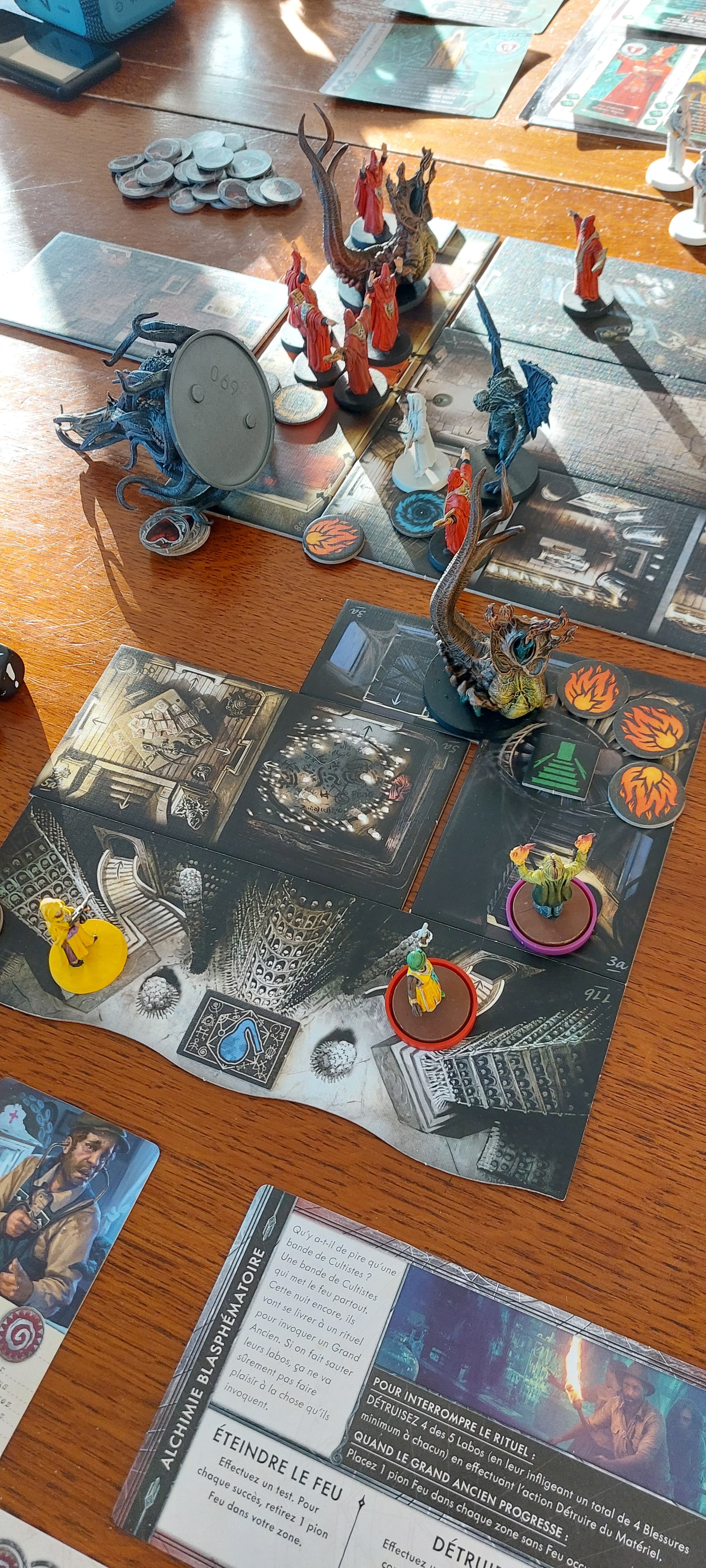 Cthulhu Death May Die : et bim ! L’ Elizabeth surstuffée (+ 8 dés vert ^^) de Krrro jr termine Hastur en tirant à travers l’escalier, heureusement parce qu’elle allait ramasser en fin de tour avec ses 8 signes jaunes… Heureusement aussi que mon Raspoutine s’était sacrifié pour elle au tour précédent pour mourir face au dernier aspect d’Hastur avant de se relever grâce à son pouvoir et continuer le combat au milieu du feu et des étudiants particulièrement bizarres de ces sinistres laboratoires… 3 ème partie en 3 jours, on se régale bien, il est passé top 1 de Krrro jr et c’est pour moi le meilleur ameritrash que j’ai eu l’occasion d’essayer !