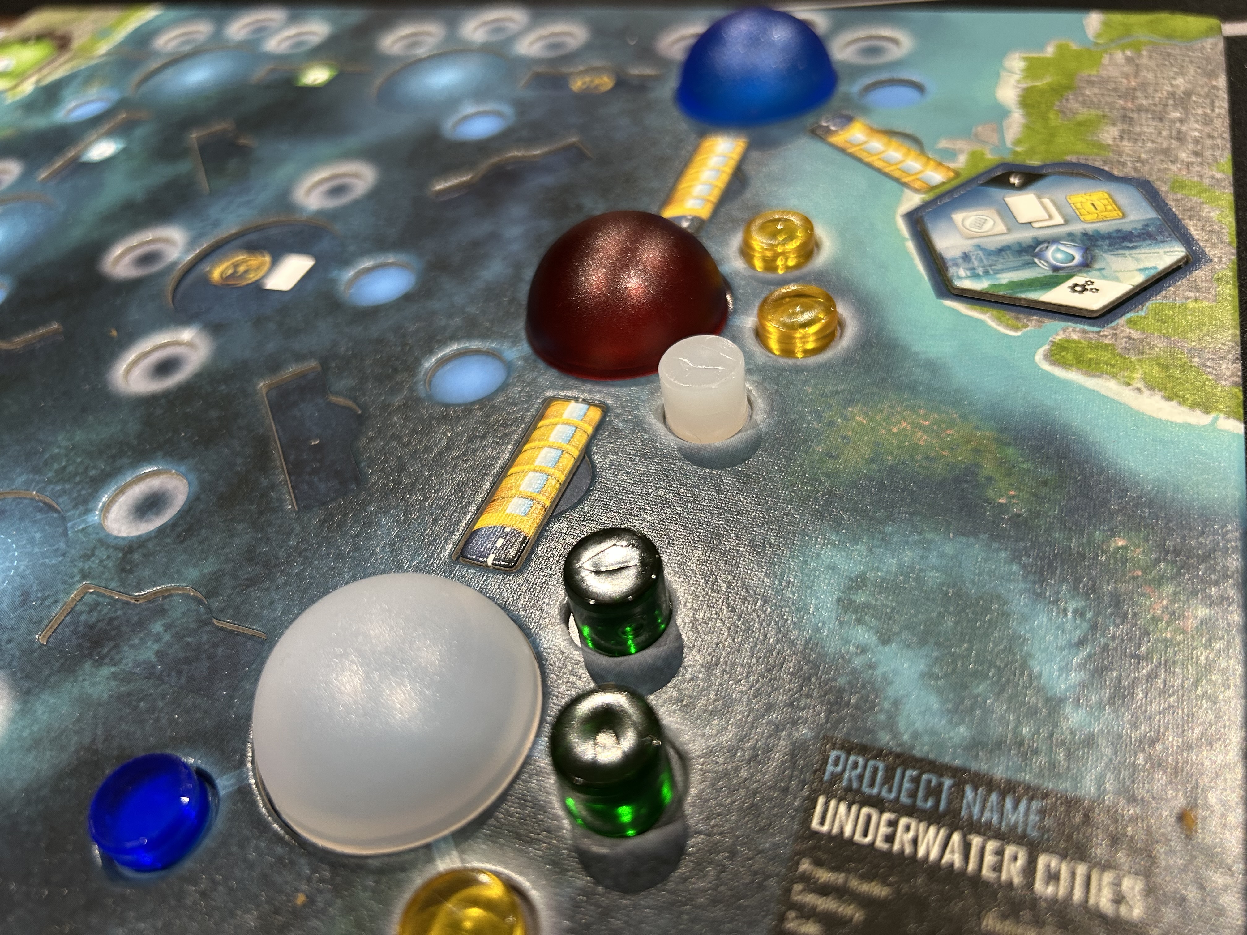 ce qui change c’est les dômes bleus et leur ressource, les disques de data, qui offre une possibilité d’une action supplémentaire durant son tour. Ou de convertir des ressources à certains moments. Cela amplifie les choix, c’est indispensable maintenant pour nous.