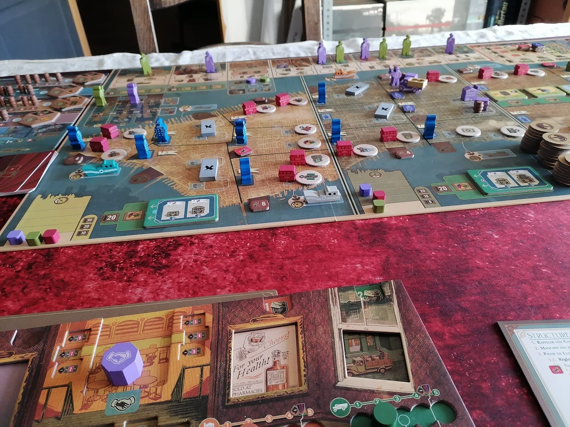 Tellement permissif et calculatoire, même quand on perd, on apprécie les sensations. Le bleu a tout enlevé, déçu de pas avoir fait mieux. Et la j’avais gagné, a seulement +1pt lorsque celui qui a fait -1pts m’a piqué la carte ville qui aurait pu me permettre de faire +5 sur une région.
