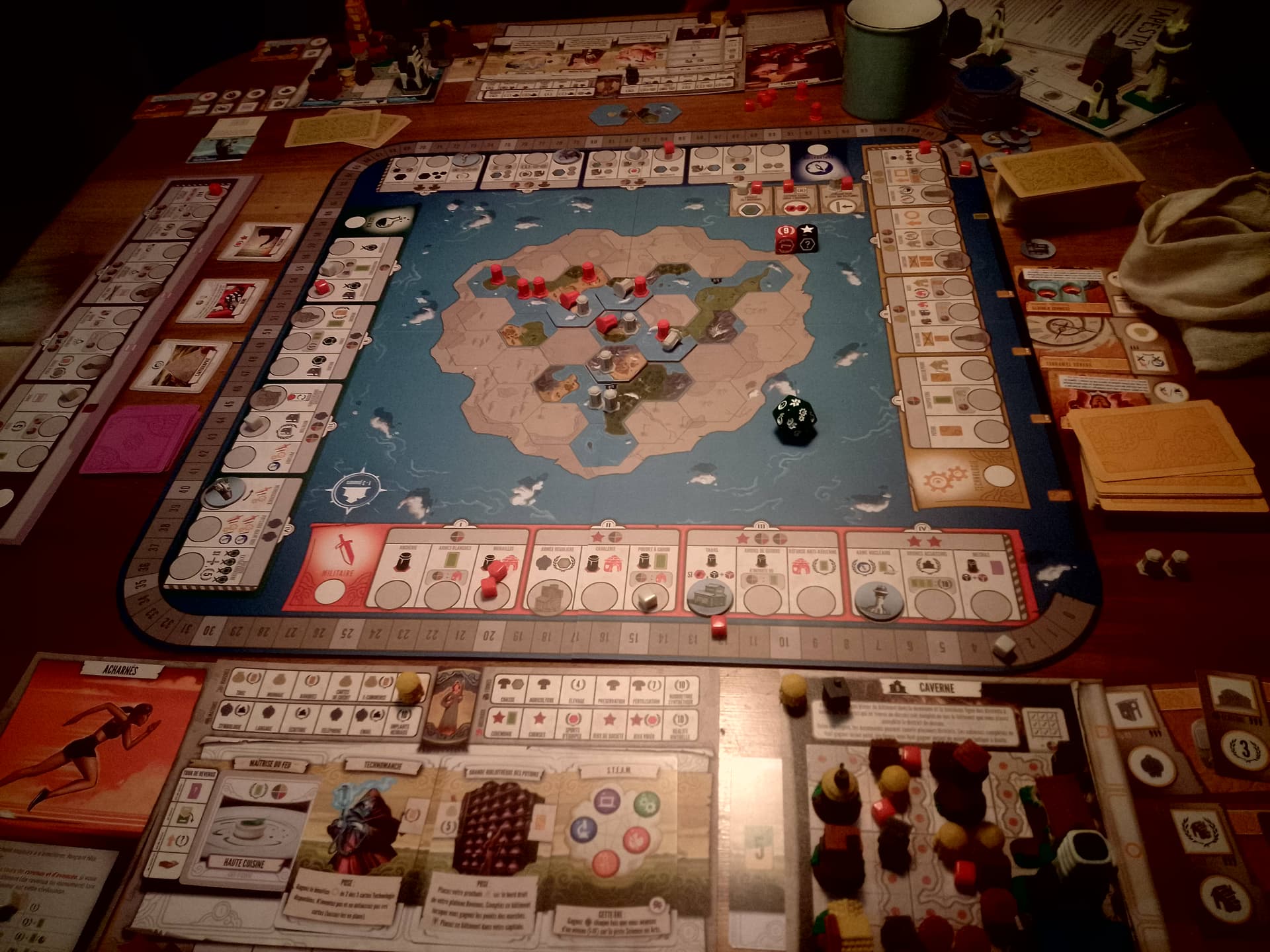 Petite question sur Tapestry: Je vois sur la photo que la première case de la fresque (maîtrise du feu) a été recouverte par une tapisserie (haute cuisine); or il me semblait qu’en fait la première posable est sur la deuxième case, ce qui change tout car au final on aurait un tour de moins (4 au lieu de 5, ce qui change tout) de jeu. Personnellement c’est ce que je fais quand je joue mais je me demandais si je ne me trompais pas… Donc au final, est-ce la bonne règle?