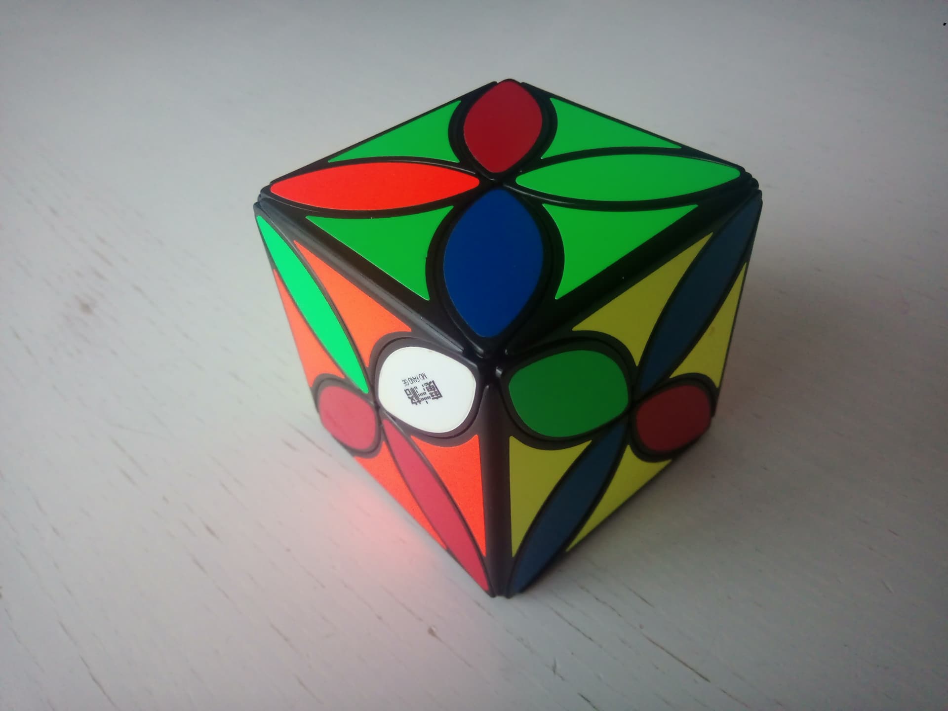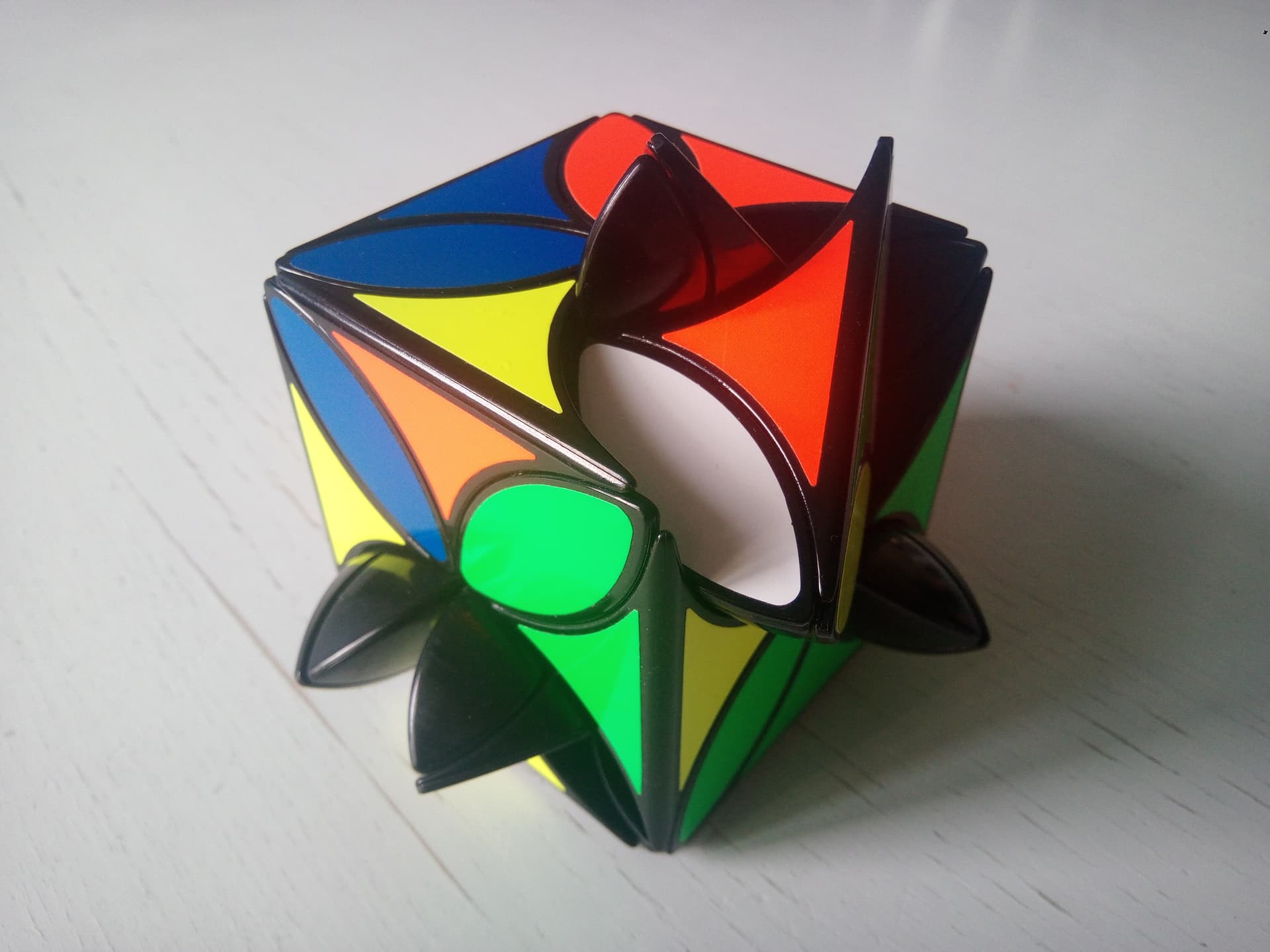 Pour ceux qui ne le connaissent pas, ce cube possède 12 axes de rotation placés au milieu de chaque arête. Il n’est pas compliqué si on le mélange gentiment mais il peut être retors si l’on complique le mélange comme j’ai fait