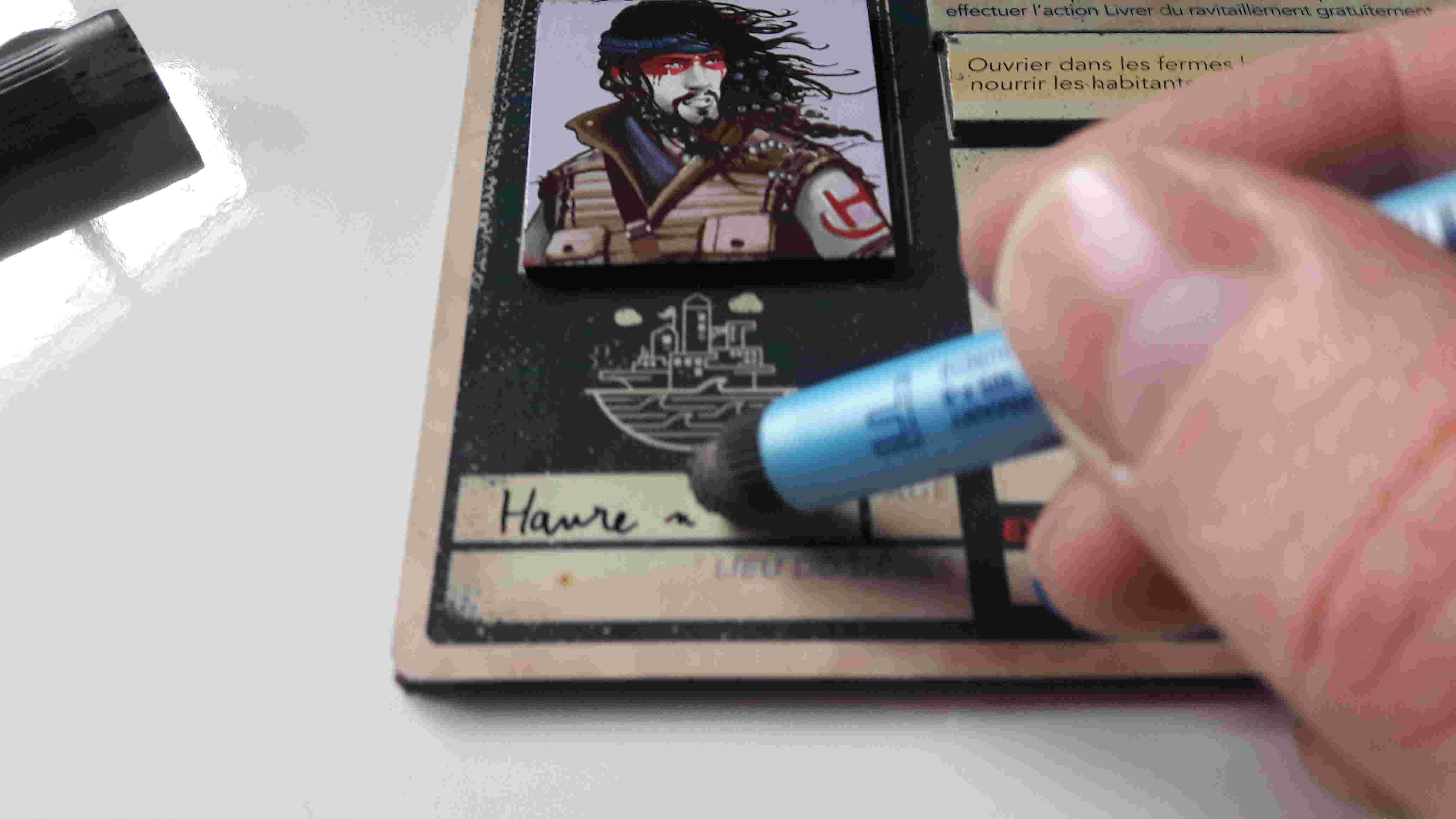 Les fiches de persos ainsi que le plateau sont recouvert d’un film plastique transparent et adhésif , sur lequel il est possible d’écrire avec un feutre non-permanent effaçable(avec un chiffon humide, cela ne laisse aucune trace) (je ne fourni pas les feutres, mais je conseille d’en avoir au moins un noir et un bleu).