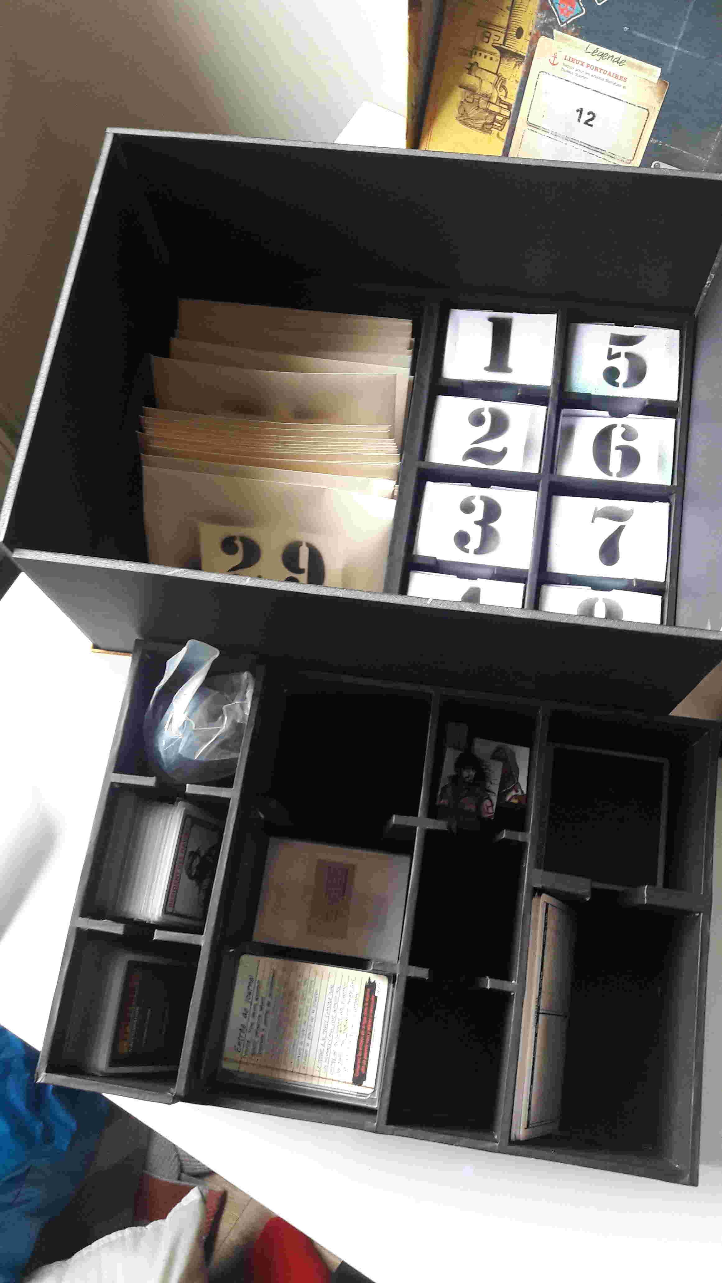 Toutes les boites ont été refaites, pour pouvoir avoir la place de ranger les cartes sleevées, et toutes les portes on soit été remplacé par des enveloppes numérotées avec le contenu à l’intérieur, soit ce sont des règles, auquel cas elles sont toutes « retournable » dans le livre des règles directement.