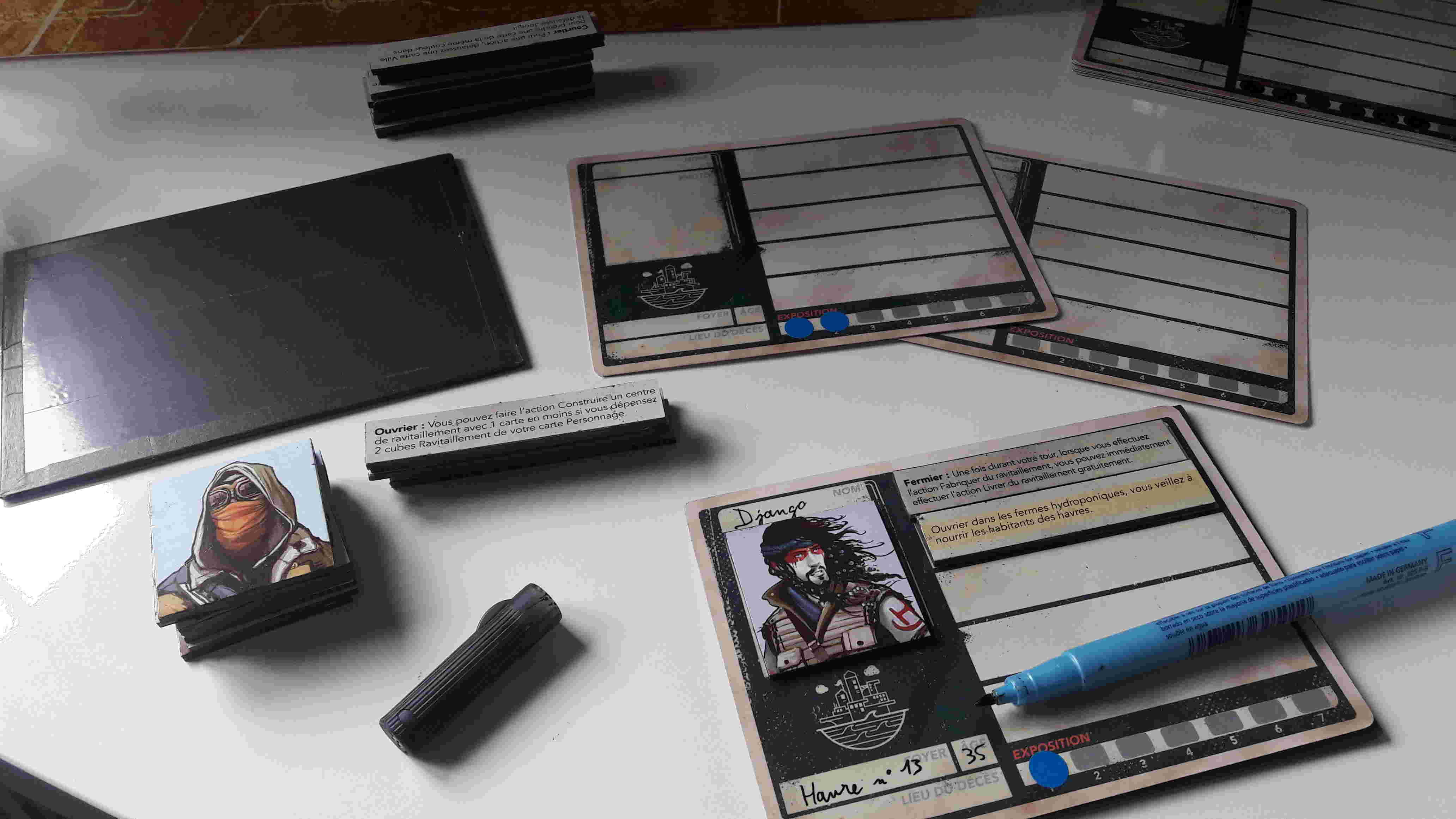 Je suis parti sur des “socles métalliques” pour les fiches de caractères et d’actions, sur lesquels viennent se magnétiser toutes les nouvelles choses (règles, profils, améliorations, handicaps,…) qui sont monté sur des magnets (de haute performances, qui ne doivent pas perdre de leur magnétisme dans le temps).